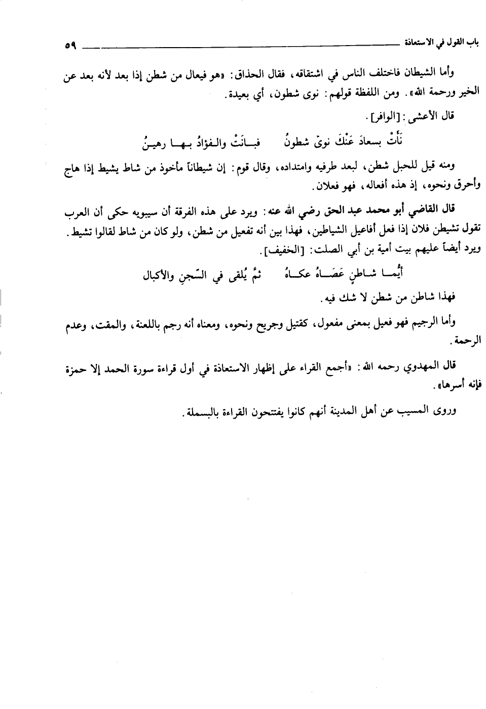 وأما الشيطان فاختلف الناس في اشتقاقه، فقال الحذاق: «هو فيعال من شطن إذا بعد لأنه بعد عن الخير ورحمة الله» . ومن اللفظة قولهم: نوى شطون، أي بعيدة.