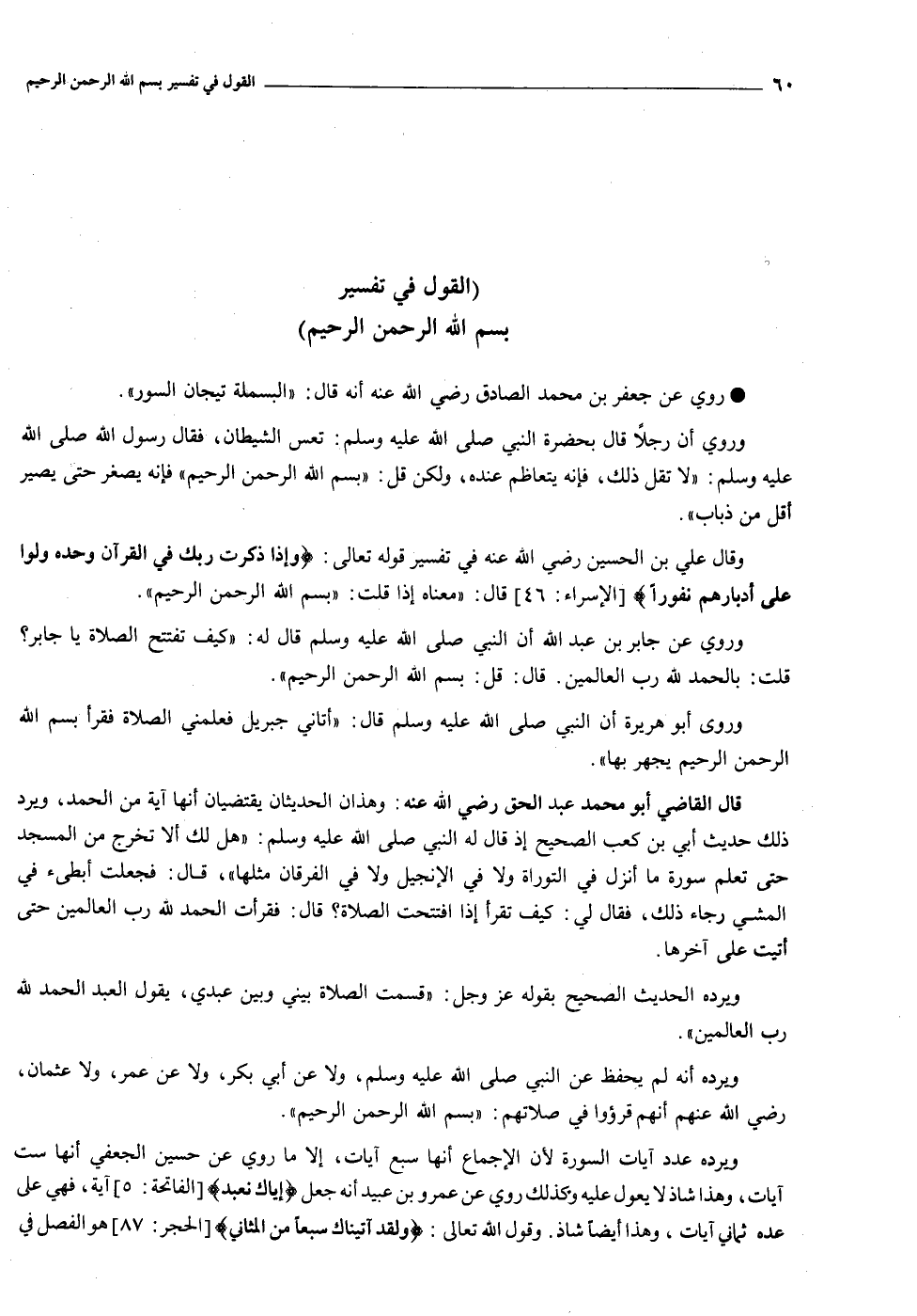 وقال علي بن الحسين رضي الله عنه في تفسير قوله تعالى: وَإِذا ذَكَرْتَ رَبَّكَ فِي الْقُرْآنِ وَحْدَهُ وَلَّوْا عَلى أَدْبارِهِمْ نُفُوراً [الإسراء: ٤٦] قال: «معناه إذا قلت: «بسم الله الرحمن الرحيم» .