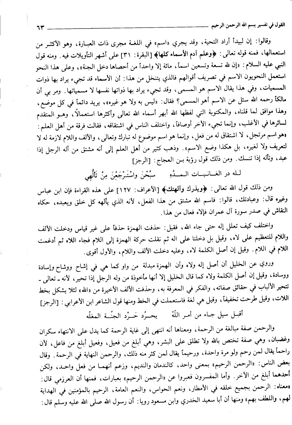 وقالوا: إن لبيدا أراد التحية، وقد يجري «اسم» في اللغة مجرى ذات العبارة، وهو الأكثر من استعمالها، فمنه قوله تعالى: وَعَلَّمَ آدَمَ الْأَسْماءَ كُلَّها [البقرة: ٣١] على أشهر التأويلات فيه. ومنه قول النبي عليه السلام: «إن لله تسعة وتسعين اسما، مائة إلا واحدا من أحصاها دخل الجنة» ، وعلى هذا النحو استعمل النحويون الاسم في تصريف أقوالهم فالذي يتنخل من هذا: أن الأسماء قد تجيء يراد بها ذوات المسميات، وفي هذا يقال الاسم هو المسمى، وقد تجيء يراد بها ذواتها نفسها لا مسمياتها. ومر بي أن مالكا رحمه الله سئل عن الاسم أهو المسمى؟ فقال: «ليس به ولا هو غيره» ، يريد دائما في كل موضع، وهذا موافق لما قلناه، والمكتوبة التي لفظها الله أبهر أسماء الله تعالى وأكثرها استعمالا، وهو المتقدم لسائرها في الأغلب، وإنما تجيء الأخر أوصافا، واختلف الناس في اشتقاقه، فقالت فرقة من أهل العلم: