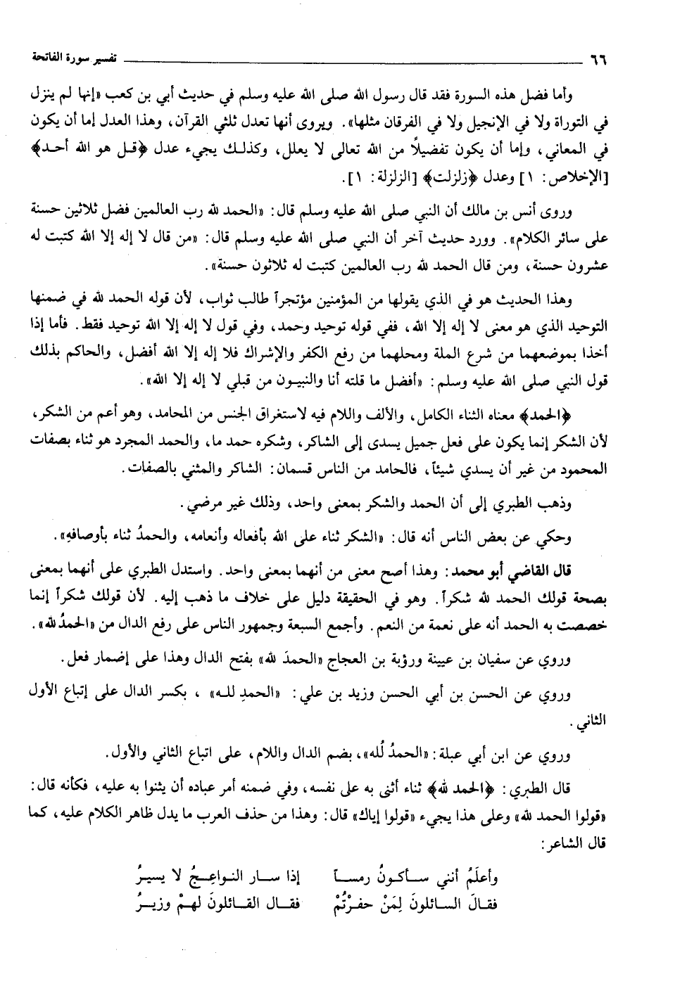 الْحَمْدُ معناه الثناء الكامل، والألف واللام فيه لاستغراق الجنس من المحامد، وهو أعم من الشكر، لأن الشكر إنما يكون على فعل جميل يسدى إلى الشاكر، وشكره حمد ما، والحمد المجرد هو ثناء بصفات المحمود من غير أن يسدي شيئا، فالحامد من الناس قسمان: الشاكر والمثني بالصفات.