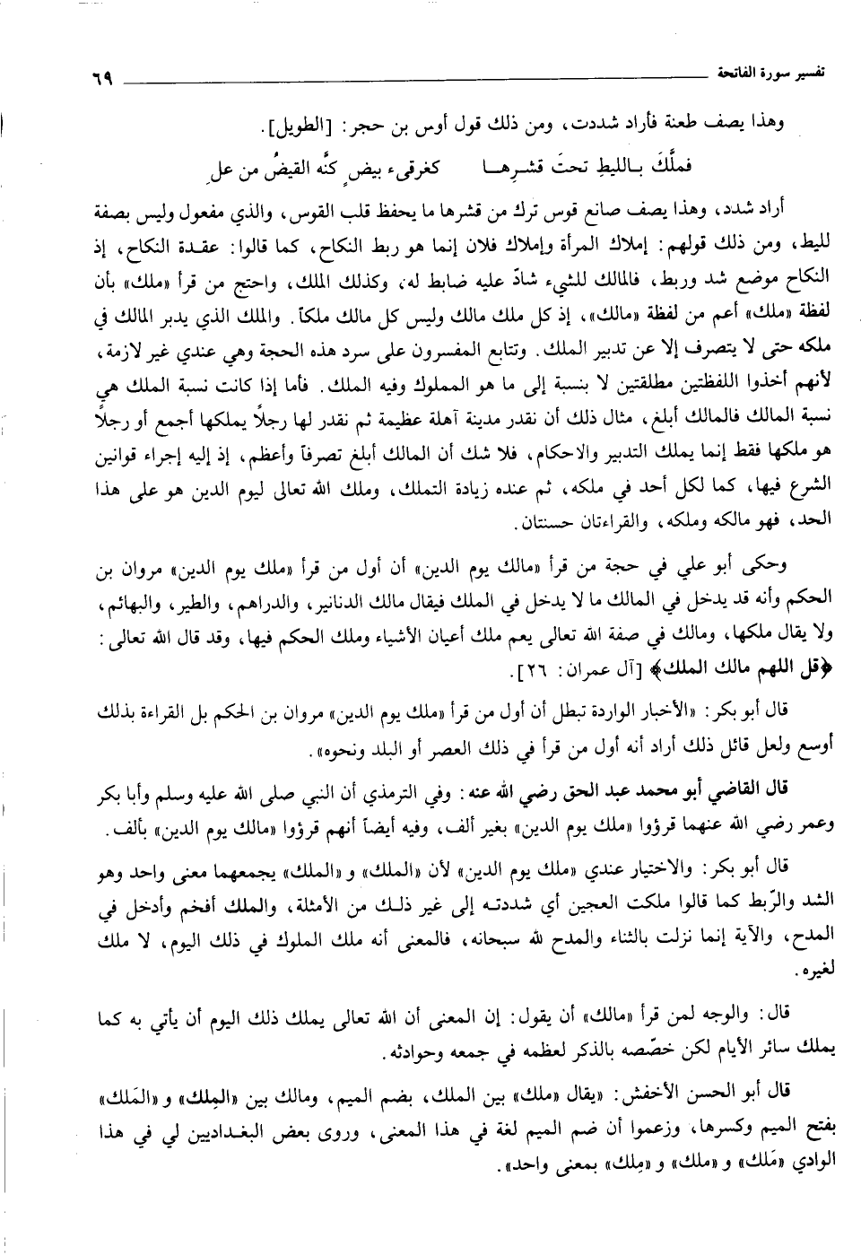 أراد شدد، وهذا يصف صانع قوس ترك من قشرها ما يحفظ قلب القوس، والذي مفعول وليس بصفة لليط، ومن ذلك قولهم: إملاك المرأة وإملاك فلان إنما هو ربط النكاح، كما قالوا: عقدة النكاح، إذ النكاح موضع شد وربط، فالمالك للشيء شادّ عليه ضابط له، وكذلك الملك، واحتج من قرأ «ملك» بأن لفظة «ملك» أعم من لفظة «مالك» ، إذ كل ملك مالك وليس كل مالك ملكا. والملك الذي يدبر المالك في ملكه حتى لا يتصرف إلا عن تدبير الملك. وتتابع المفسرون على سرد هذه الحجة وهي عندي غير لازمة، لأنهم أخذوا اللفظتين مطلقتين لا بنسبة إلى ما هو المملوك وفيه الملك. فأما إذا كانت نسبة الملك هي نسبة المالك فالمالك أبلغ، مثال ذلك أن نقدر مدينة آهلة عظيمة ثم نقدر لها رجلا يملكها أجمع أو رجلا هو ملكها فقط إنما يملك التدبير والاحكام، فلا شك أن المالك أبلغ تصرفا وأعظم، إذ إليه إجراء قوانين الشرع فيها، كما لكل أحد في ملكه، ثم عنده زيادة التملك، وملك الله تعالى ليوم الدين هو على هذا الحد، فهو مالكه وملكه، والقراءتان حسنتان.