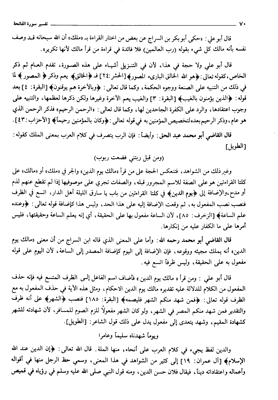 قال أبو علي: ومن قرأ «مالك يوم الدين» فأضاف اسم الفاعل إلى الظرف المتسع فيه فإنه حذف المفعول من الكلام للدلالة عليه تقديره مالك يوم الدين الاحكام، ومثل هذه الآية في حذف المفعول به مع الظرف قوله تعالى: فَمَنْ شَهِدَ مِنْكُمُ الشَّهْرَ فَلْيَصُمْهُ [البقرة: ١٨٥] فنصب الشَّهْرَ على أنه ظرف والتقدير فمن شهد منكم المصر في الشهر، ولو كان الشهر مفعولا للزم الصوم للمسافر، لأن شهادته للشهر كشهادة المقيم، وشهد يتعدى إلى مفعول يدل على ذلك قول الشاعر: [الطويل] .