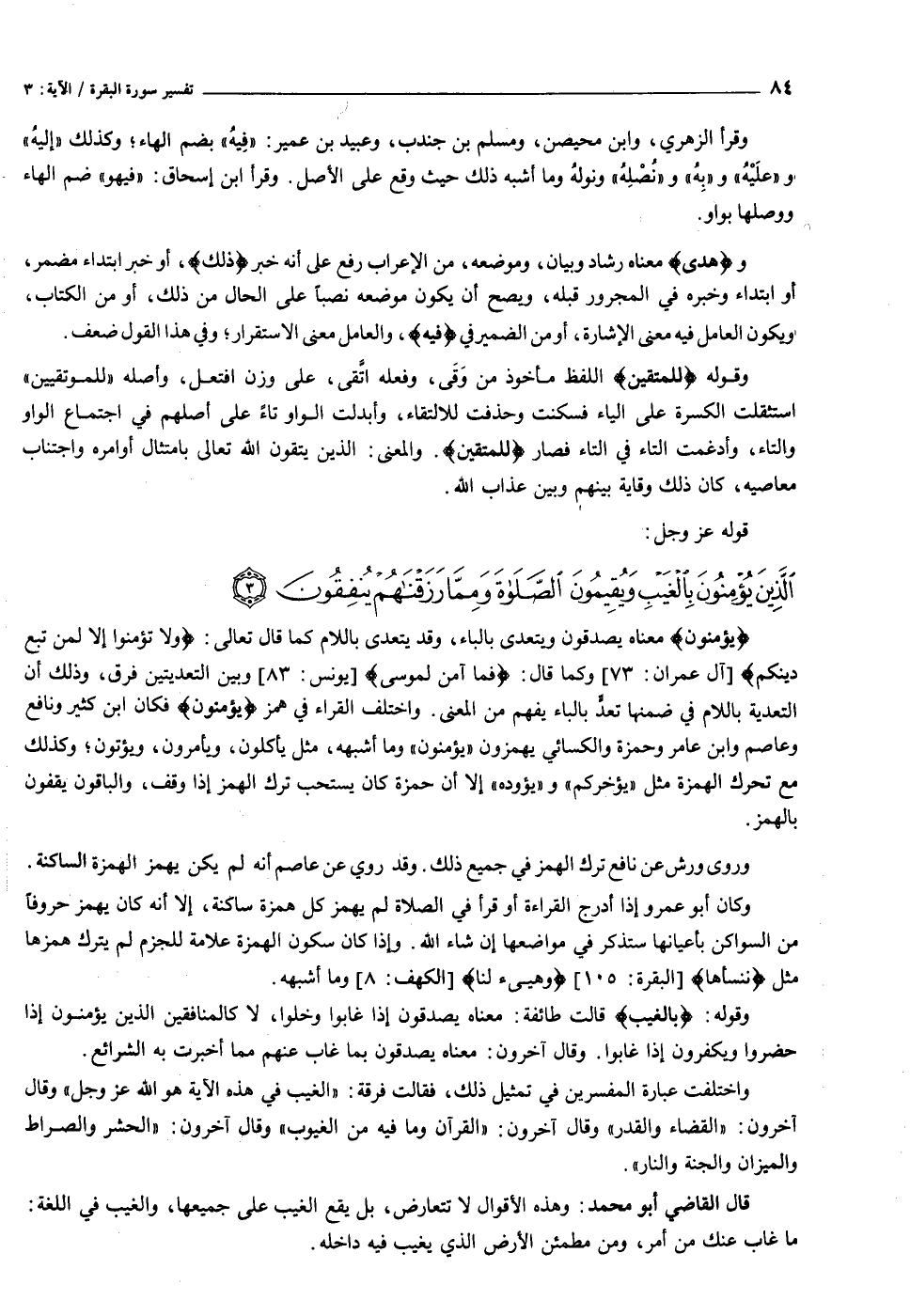 واختلفت عبارة المفسرين في تمثيل ذلك، فقالت فرقة: «الغيب في هذه الآية هو الله عز وجل» وقال آخرون: «القضاء والقدر» وقال آخرون: «القرآن وما فيه من الغيوب» وقال آخرون: «الحشر والصراط والميزان والجنة والنار» .