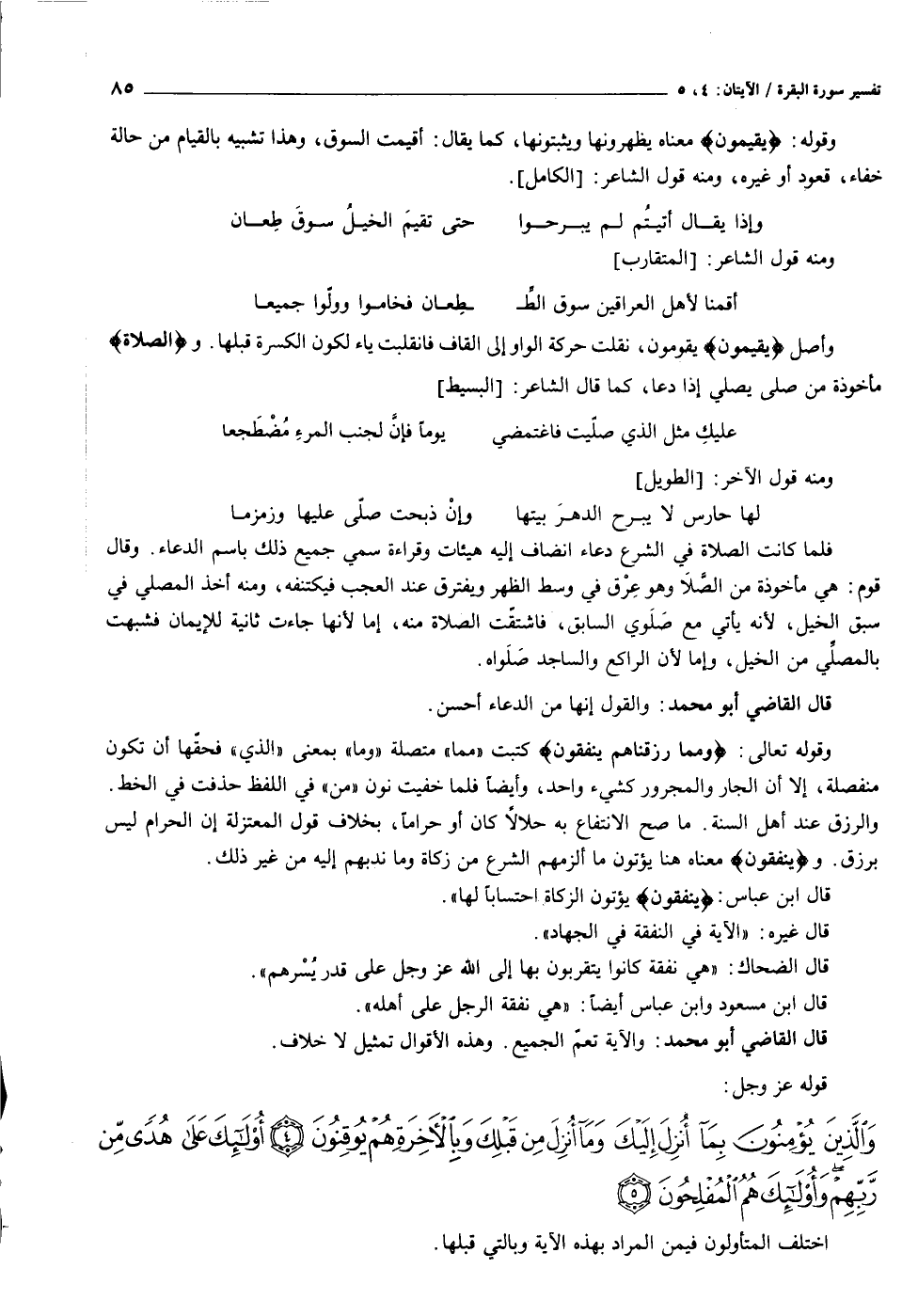 وأصل يُقِيمُونَ يقومون، نقلت حركة الواو إلى القاف فانقلبت ياء لكون الكسرة قبلها. والصَّلاةَ مأخوذة من صلى يصلي إذا دعا، كما قال الشاعر: [البسيط]