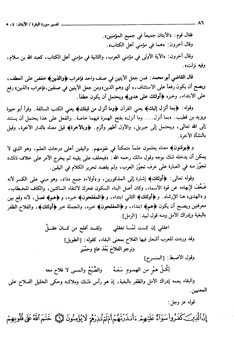 وقوله تعالى: أُولئِكَ إشارة إلى المذكورين، و «أولاء» جمع «ذا» ، وهو مبني على الكسر لأنه ضعف لإبهامه عن قوة الأسماء، وكان أصل البناء السكون فحرك لالتقاء الساكنين، والكاف للخطاب، و «الهدى» هنا الإرشاد. وأُولئِكَ الثاني ابتداء، والْمُفْلِحُونَ خبره، وهُمُ فصل، لأنه وقع بين معرفتين ويصح أن يكون هُمُ ابتداء، والْمُفْلِحُونَ خبره، والجملة خبر أُولئِكَ، والفلاح الظفر بالبغية وإدراك الأمل ومنه قول لبيد: [الرمل] .