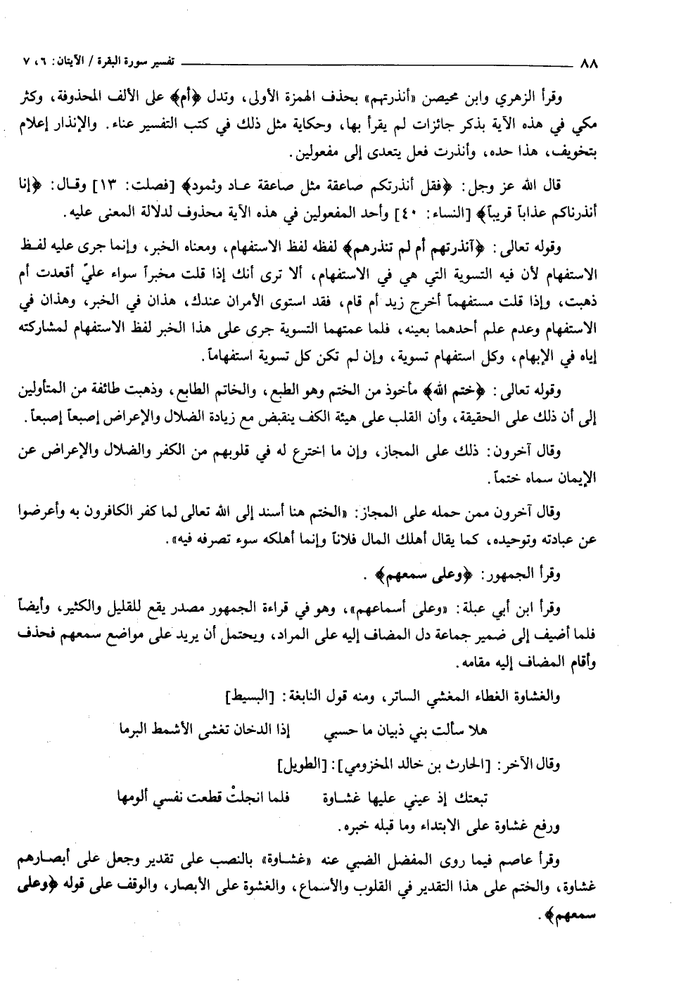 وقرأ عاصم فيما روى المفضل الضبي عنه «غشاوة» بالنصب على تقدير وجعل على أبصارهم غشاوة، والختم على هذا التقدير في القلوب والأسماع، والغشوة على الأبصار، والوقف على قوله وَعَلى سَمْعِهِمْ.