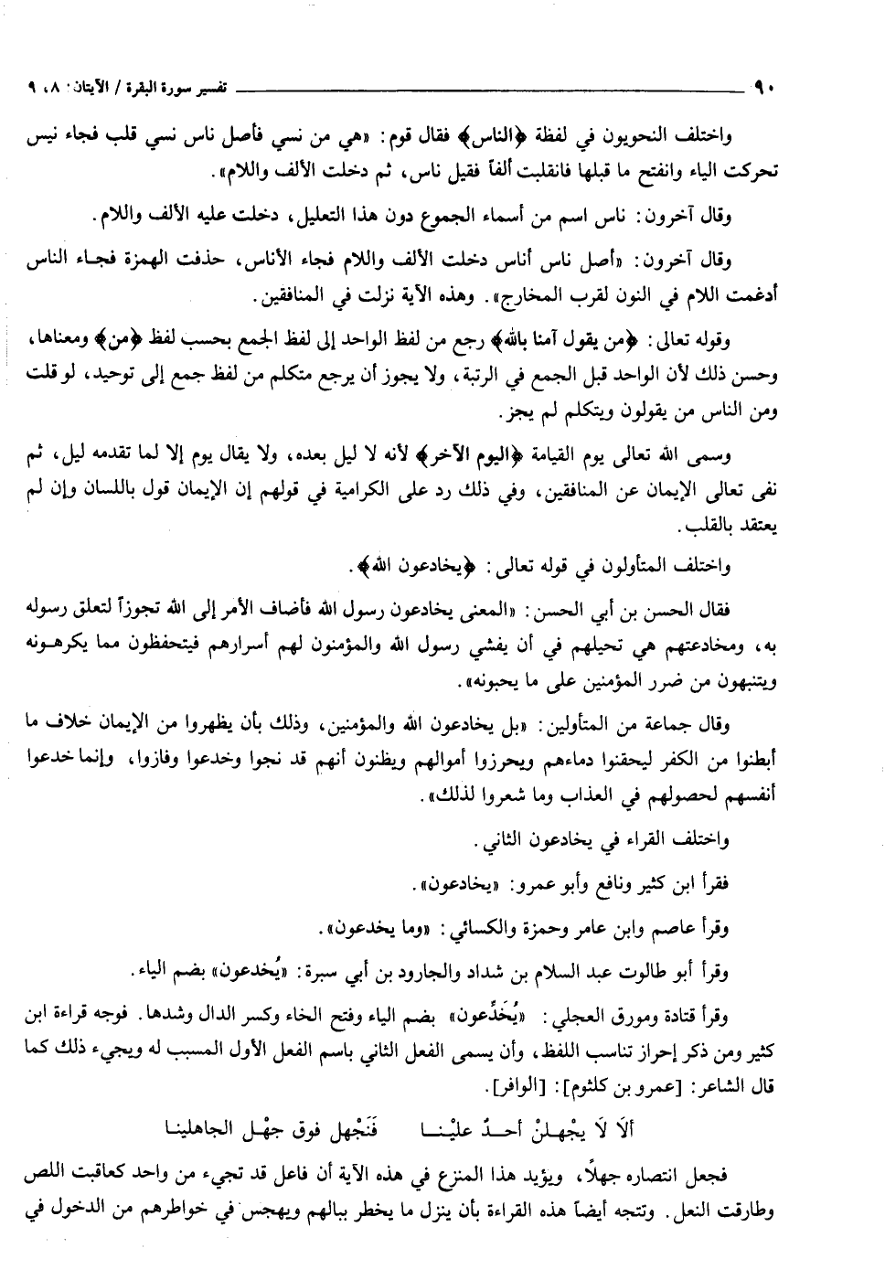 وقرأ قتادة ومورق العجلي: «يخدّعون» بضم الياء وفتح الخاء وكسر الدال وشدها. فوجه قراءة ابن كثير ومن ذكر إحراز تناسب اللفظ، وأن يسمى الفعل الثاني باسم الفعل الأول المسبب له ويجيء ذلك كما قال الشاعر: [عمرو بن كلثوم] : [الوافر] .