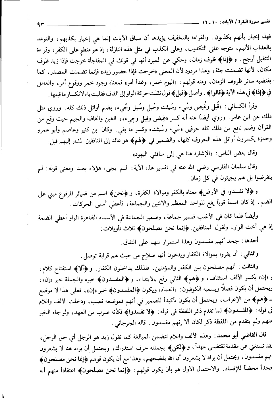 قال القاضي أبو محمد: وهذه الألف واللام تتضمن المبالغة كما تقول زيد هو الرجل أي حق الرجل، فقد تستغني عن مقدمة تقتضي عهدا، ولكِنْ بجملته حرف استدراك، ويحتمل أن يراد هنا لا يشعرون أنهم مفسدون، ويحتمل أن يراد لا يشعرون أن الله يفضحهم، وهذا مع أن يكون قولهم إِنَّما نَحْنُ مُصْلِحُونَ جحدا محضا للإفساد. والاحتمال الأول هو بأن يكون قولهم: إِنَّما نَحْنُ مُصْلِحُونَ اعتقادا منهم أنه