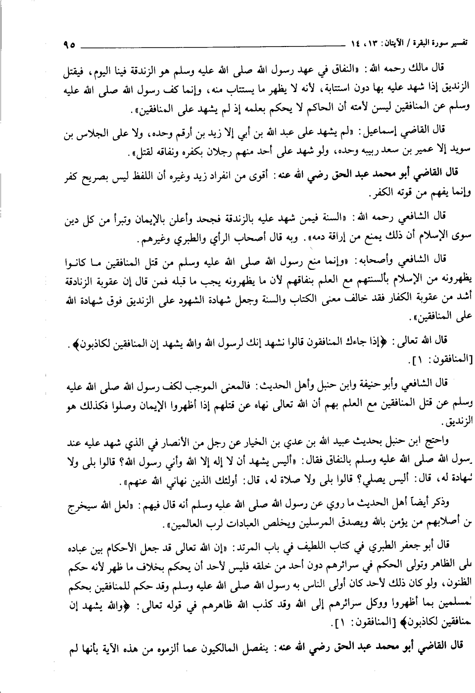 قال الشافعي وأبو حنيفة وابن حنبل وأهل الحديث: فالمعنى الموجب لكف رسول الله صلى الله عليه وسلم عن قتل المنافقين مع العلم بهم أن الله تعالى نهاه عن قتلهم إذا أظهروا الإيمان وصلوا فكذلك هو الزنديق.