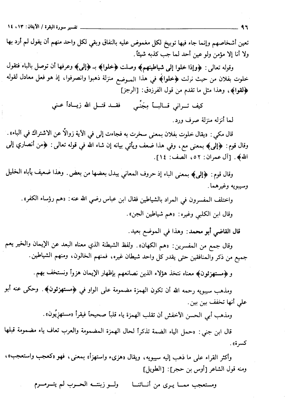 وقوله تعالى: وَإِذا خَلَوْا إِلى شَياطِينِهِمْ وصلت خَلَوْا ب إِلى وعرفها أن توصل بالباء فتقول خلوت بفلان من حيث نزلت خَلَوْا في هذا الموضع منزلة ذهبوا وانصرفوا، إذ هو فعل معادل لقوله لَقُوا، وهذا مثل ما تقدم من قول الفرزدق: [الرجز]