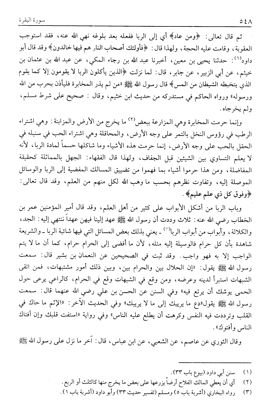 ثُمَّ قَالَ تَعَالَى: وَمَنْ عادَ أَيْ إِلَى الربا ففعله بعد بلوغه نهي الله عَنْهُ، فَقَدِ اسْتَوْجَبَ الْعُقُوبَةَ، وَقَامَتْ عَلَيْهِ الْحُجَّةُ، وَلِهَذَا قَالَ: فَأُولئِكَ أَصْحابُ النَّارِ هُمْ فِيها خالِدُونَ وَقَدْ قَالَ أَبُو دَاوُدَ «1» : حَدَّثَنَا يَحْيَى بْنُ مَعِينٍ، أَخْبَرَنَا عَبْدُ اللَّهِ بْنُ رَجَاءٍ الْمَكِّيُّ، عَنْ عَبْدِ اللَّهِ بْنِ عُثْمَانَ بْنِ خيثم، عَنْ أَبِي الزُّبَيْرِ، عَنْ جَابِرٍ، قَالَ: لَمَّا نَزَلَتْ الَّذِينَ يَأْكُلُونَ الرِّبا لَا يَقُومُونَ إِلَّا كَما يَقُومُ الَّذِي يَتَخَبَّطُهُ الشَّيْطانُ مِنَ الْمَسِّ قَالَ رَسُولُ اللَّهِ صَلَّى اللَّهُ عَلَيْهِ وَسَلَّمَ «مَنْ لَمْ يَذْرِ الْمُخَابَرَةَ فَلْيَأْذَنْ بِحَرْبٍ مِنَ اللَّهِ وَرَسُولِهِ» وَرَوَاهُ الْحَاكِمُ فِي مُسْتَدْرَكِهِ مِنْ حَدِيثِ ابْنِ خُثَيْمٍ، وَقَالَ: صَحِيحٌ عَلَى شَرْطِ مُسْلِمٍ، وَلَمْ يُخَرِّجَاهُ.