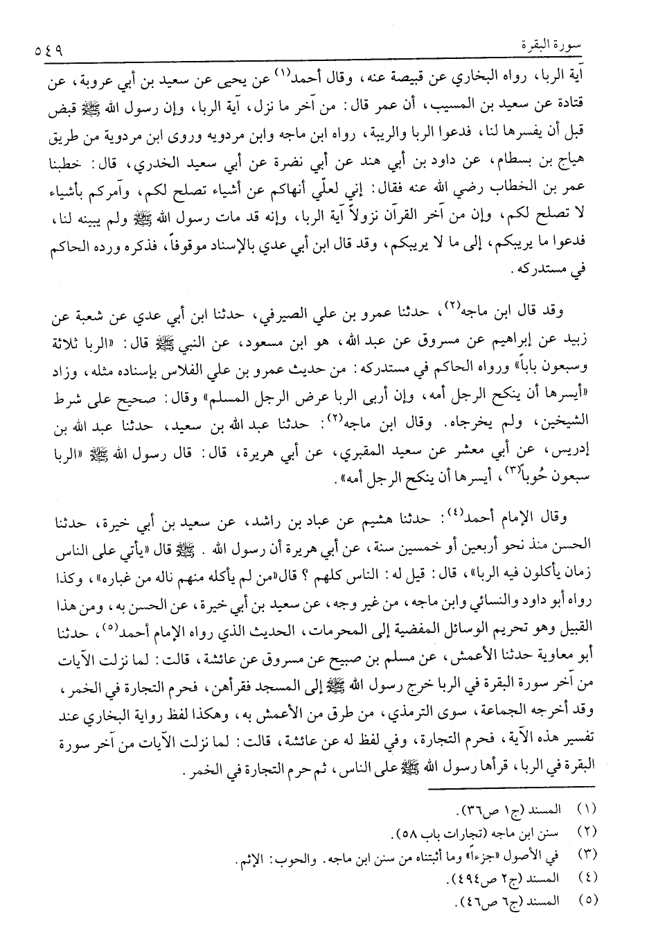 وَقَالَ الْإِمَامُ أَحْمَدُ «5» : حَدَّثَنَا هُشَيْمٌ عَنْ عَبَّادِ بْنِ رَاشِدٍ، عَنْ سَعِيدِ بْنِ أبي خيرة، حدثنا الحسن منذ نحو أَرْبَعِينَ أَوْ خَمْسِينَ سَنَةً، عَنْ أَبِي هُرَيْرَةَ أَنَّ رَسُولَ اللَّهِ. صَلَّى الله عليه وسلم قَالَ «يَأْتِي عَلَى النَّاسِ زَمَانٌ يَأْكُلُونَ فِيهِ الرِّبَا» ، قَالَ: قِيلَ لَهُ: النَّاسُ كُلُّهُمْ؟ قَالَ «مَنْ لَمْ يَأْكُلْهُ مِنْهُمْ نَالَهُ مِنْ غُبَارِهِ» ، وَكَذَا رَوَاهُ أَبُو دَاوُدَ وَالنَّسَائِيُّ وَابْنُ مَاجَهْ، مِنْ غَيْرِ وَجْهٍ، عَنْ سَعِيدِ بْنِ أَبِي خَيْرَةَ، عَنِ الْحَسَنِ بِهِ، وَمِنْ هَذَا الْقَبِيلِ وَهُوَ تَحْرِيمُ الْوَسَائِلِ الْمُفْضِيَةِ إِلَى الْمُحَرَّمَاتِ، الْحَدِيثُ الَّذِي رَوَاهُ الْإِمَامُ أَحْمَدُ «6» ، حَدَّثَنَا أَبُو مُعَاوِيَةَ حَدَّثَنَا الْأَعْمَشُ، عَنْ مُسْلِمِ بْنِ صُبَيْحٍ عَنْ مَسْرُوقٍ عَنْ عَائِشَةَ، قَالَتْ: لَمَّا نَزَلَتِ الْآيَاتُ من آخر سورة الْبَقَرَةِ فِي الرِّبَا خَرَجَ رَسُولُ اللَّهِ صَلَّى اللَّهُ عَلَيْهِ وَسَلَّمَ إِلَى الْمَسْجِدِ فَقَرَأَهُنَّ، فَحَرَّمَ التِّجَارَةَ فِي الْخَمْرِ، وَقَدْ أَخْرَجَهُ الْجَمَاعَةُ، سِوَى الترمذي، من طرق من الْأَعْمَشِ بِهِ، وَهَكَذَا لَفْظُ رِوَايَةِ الْبُخَارِيِّ عِنْدَ تفسير هذه الْآيَةِ، فَحَرَّمَ التِّجَارَةَ، وَفِي لَفْظٍ لَهُ عَنْ عَائِشَةَ، قَالَتْ: لَمَّا نَزَلَتِ الْآيَاتُ مِنْ آخِرِ سُورَةِ الْبَقَرَةِ فِي الرِّبَا، قَرَأَهَا رَسُولُ اللَّهِ صَلَّى اللَّهُ عَلَيْهِ وَسَلَّمَ عَلَى النَّاسِ، ثُمَّ حرم التجارة في الخمر.