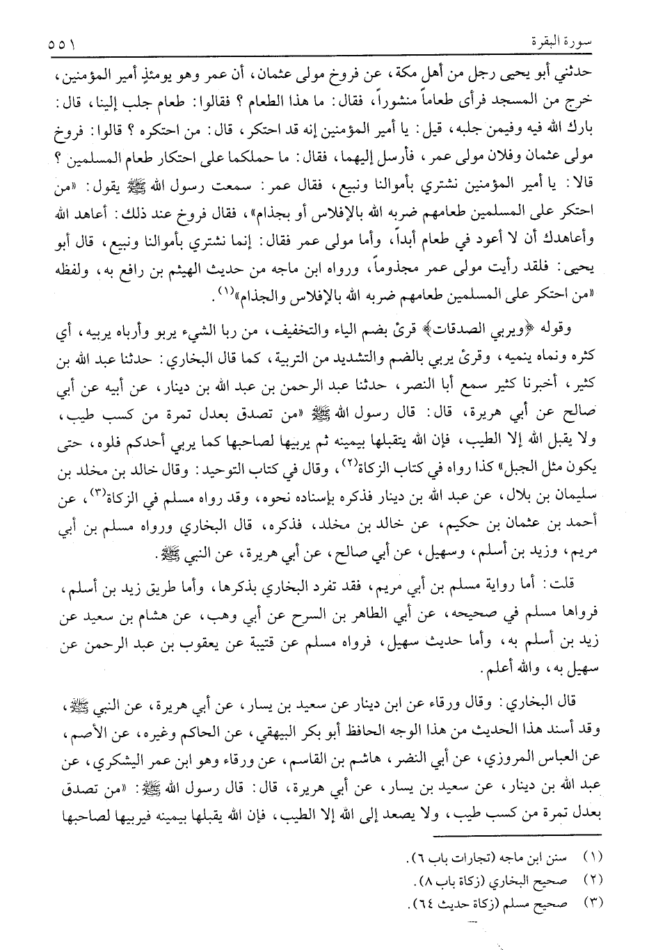 وَقَوْلُهُ وَيُرْبِي الصَّدَقاتِ قُرِئَ بِضَمِّ الْيَاءِ وَالتَّخْفِيفِ، من ربا الشيء يربو وأرباه يربيه، أي كثره ونماه ينميه، وقرئ يربي بِالضَّمِّ وَالتَّشْدِيدِ مِنَ التَّرْبِيَةِ، كَمَا قَالَ الْبُخَارِيُّ: حدثنا عبد الله بن كثير، أخبرنا كثير سمع أبا النصر، حَدَّثَنَا عَبْدُ الرَّحْمَنِ بْنُ عَبْدِ اللَّهِ بْنِ دِينَارٍ، عَنْ أَبِيهِ عَنْ أَبِي صَالِحٍ عَنْ أَبِي هُرَيْرَةَ، قَالَ: قَالَ رَسُولُ اللَّهِ صَلَّى اللَّهُ عَلَيْهِ وَسَلَّمَ «من تصدق بعدل تمرة مِنْ كَسْبٍ طَيِّبٍ، وَلَا يَقْبَلُ اللَّهُ إِلَّا الطيب، فإن الله يتقبلها بيمينه ثم يربيها لصاحبها كَمَا يُرَبِّي أَحَدُكُمْ فَلُوَّهُ، حَتَّى يَكُونَ مِثْلَ الْجَبَلِ» كَذَا رَوَاهُ فِي كِتَابِ الزَّكَاةِ «2» ، وَقَالَ فِي كِتَابِ التَّوْحِيدِ: وَقَالَ خَالِدُ بْنُ مَخْلَدٍ بن سُلَيْمَانَ بْنِ بِلَالٍ، عَنْ عَبْدِ اللَّهِ بْنِ دينار فذكره بِإِسْنَادِهِ نَحْوَهُ، وَقَدْ رَوَاهُ مُسْلِمٌ فِي الزَّكَاةِ «3» ، عَنْ أَحْمَدَ بْنِ عُثْمَانَ بْنِ حَكِيمٍ، عَنْ خَالِدِ بْنِ مَخْلَدٍ، فَذَكَرَهُ، قَالَ الْبُخَارِيُّ وَرَوَاهُ مُسْلِمُ بْنُ أَبِي مَرْيَمَ، وَزَيْدُ بْنُ أَسْلَمَ، وَسُهَيْلٌ، عَنْ أَبِي صَالِحٍ، عَنْ أَبِي هُرَيْرَةَ، عَنِ النَّبِيِّ صَلَّى اللَّهُ عَلَيْهِ وَسَلَّمَ.