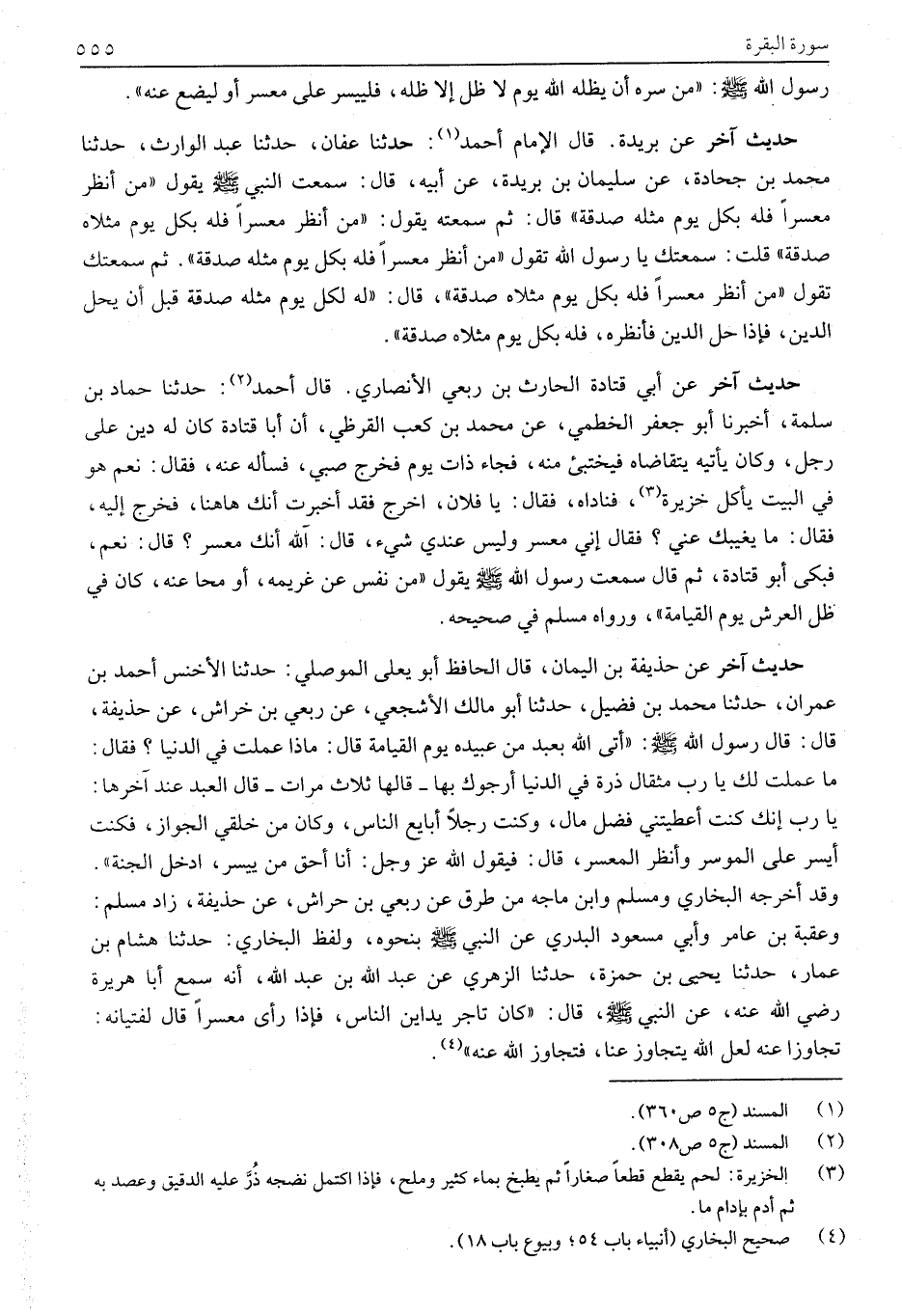 رسول الله صلى الله عليه وسلم: «من سَرَّهُ أَنْ يُظِلَّهُ اللَّهُ يَوْمَ لَا ظِلَّ إِلَّا ظِلُّهُ، فَلْيُيَسِّرْ عَلَى مُعْسِرٍ أَوْ لِيَضَعْ عَنْهُ» .