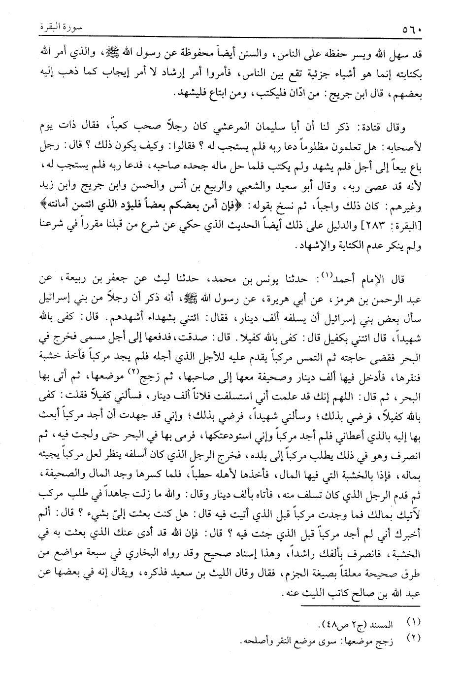 قَالَ الْإِمَامُ أَحْمَدُ «1» : حَدَّثَنَا يُونُسُ بْنُ مُحَمَّدٍ، حَدَّثَنَا لَيْثٌ عَنْ جَعْفَرِ بْنِ رَبِيعَةَ، عَنْ عَبْدِ الرَّحْمَنِ بْنِ هُرْمُزَ، عَنْ أَبِي هُرَيْرَةَ، عَنْ رَسُولِ اللَّهِ صَلَّى اللَّهُ عَلَيْهِ وَسَلَّمَ، أَنَّهُ ذَكَرَ أَنَّ رَجُلًا مِنْ بَنِي إِسْرَائِيلَ سَأَلَ بَعْضَ بَنِي إِسْرَائِيلَ أَنْ يُسْلِفَهُ أَلْفَ دِينَارٍ، فَقَالَ: ائْتِنِي بِشُهَدَاءَ أُشْهِدُهُمْ. قَالَ: كَفَى بِاللَّهِ شَهِيدًا، قَالَ ائْتِنِي بِكَفِيلٍ قَالَ: كَفَى بالله كفيلا. قال: صدقت، فدفعها إِلَى أَجَلٍ مُسَمًّى فَخَرَجَ فِي الْبَحْرِ فَقَضَى حَاجَتَهُ ثُمَّ الْتَمَسَ مَرْكَبًا يَقَدَمُ عَلَيْهِ لِلْأَجَلِ الذي أجله فلم يجد مركبا فأخذ خشبة فَنَقَرَهَا، فَأَدْخَلَ فِيهَا أَلْفَ دِينَارٍ وَصَحِيفَةً مَعَهَا إِلَى صَاحِبِهَا، ثُمَّ زَجَّجَ «2» مَوْضِعَهَا، ثُمَّ أَتَى بِهَا الْبَحْرَ، ثُمَّ قَالَ: اللَّهُمَّ إِنَّكَ قَدْ عَلِمْتَ أَنِّي اسْتَسْلَفْتُ فُلَانًا أَلْفَ دِينَارٍ، فَسَأَلَنِي كَفِيلًا فَقُلْتُ: كَفَى بِاللَّهِ كَفِيلًا، فَرَضِيَ بِذَلِكَ وسألني شَهِيدًا، فَرَضِيَ بِذَلِكَ وَإِنِّي قَدْ جَهِدْتُ أَنْ أَجِدَ مَرْكَبًا أَبْعَثُ بِهَا إِلَيْهِ بِالَّذِي أَعْطَانِي فَلَمْ أَجِدْ مَرْكَبًا وَإِنِّي اسْتَوْدَعْتُكَهَا، فَرَمَى بِهَا فِي الْبَحْرِ حَتَّى وَلَجَتْ فِيهِ، ثُمَّ انْصَرَفَ وَهُوَ فِي ذَلِكَ يَطْلُبُ مَرْكَبًا إِلَى بَلَدِهِ، فَخَرَجَ الرَّجُلُ الَّذِي كَانَ أَسْلَفَهُ يَنْظُرُ لَعَلَّ مَرْكَبًا يَجِيئُهُ بِمَالِهِ، فَإِذَا بِالْخَشَبَةِ الَّتِي فِيهَا الْمَالُ، فَأَخَذَهَا لِأَهْلِهِ حَطَبًا، فَلَمَّا كَسَرَهَا وَجَدَ الْمَالَ وَالصَّحِيفَةَ، ثُمَّ قَدِمَ الرَّجُلُ الَّذِي كَانَ تَسَلَّفَ مِنْهُ، فَأَتَاهُ بِأَلْفِ دِينَارٍ وَقَالَ: وَاللَّهِ مَا زِلْتُ جَاهِدًا فِي طَلَبِ مَرْكَبٍ لِآتِيَكَ بِمَالِكَ فَمَا وَجَدْتُ مَرْكَبًا قَبْلَ الَّذِي أَتَيْتُ فِيهِ قَالَ: هَلْ كُنْتَ بَعَثْتَ إِلَيَّ بِشَيْءٍ؟ قَالَ: أَلَمْ أُخْبِرْكَ أَنِّي لَمْ أَجِدْ مَرْكَبًا قبل الَّذِي جِئْتُ فِيهِ؟ قَالَ: فَإِنَّ اللَّهَ قَدْ أَدَّى عَنْكَ الَّذِي بَعَثْتَ بِهِ فِي الْخَشَبَةِ، فَانْصَرِفْ بِأَلْفِكَ رَاشِدًا، وَهَذَا إِسْنَادٌ صَحِيحٌ وَقَدْ رَوَاهُ الْبُخَارِيُّ فِي سَبْعَةِ مَوَاضِعَ مِنْ طُرُقٍ صَحِيحَةٍ مُعَلَّقًا بِصِيغَةِ الْجَزْمِ، فَقَالَ وَقَالَ اللَّيْثُ بن سعيد فذكره، ويقال إنه فِي بَعْضِهَا عَنْ عَبْدِ اللَّهِ بْنِ صَالِحٍ كَاتِبِ اللَّيْثِ عنه.