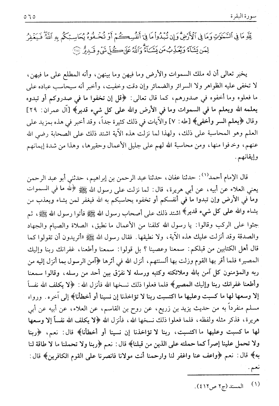 قَالَ الْإِمَامُ أَحْمَدُ «1» : حَدَّثَنَا عَفَّانُ، حَدَّثَنَا عَبْدُ الرَّحْمَنِ بْنُ إِبْرَاهِيمَ، حَدَّثَنِي أَبُو عَبْدِ الرَّحْمَنِ يَعْنِي الْعَلَاءَ عَنْ أَبِيهِ، عَنْ أَبِي هُرَيْرَةَ، قَالَ: لَمَّا نَزَلَتْ عَلَى رَسُولِ اللَّهِ صَلَّى اللَّهُ عَلَيْهِ وَسَلَّمَ لِلَّهِ مَا فِي السَّماواتِ وَما فِي الْأَرْضِ وَإِنْ تُبْدُوا مَا فِي أَنْفُسِكُمْ أَوْ تُخْفُوهُ يُحاسِبْكُمْ بِهِ اللَّهُ فَيَغْفِرُ لِمَنْ يَشاءُ وَيُعَذِّبُ مَنْ يَشاءُ وَاللَّهُ عَلى كُلِّ شَيْءٍ قَدِيرٌ اشْتَدَّ ذَلِكَ عَلَى أَصْحَابِ رَسُولِ اللَّهِ صَلَّى اللَّهُ عَلَيْهِ وَسَلَّمَ فَأَتَوْا رَسُولَ اللَّهِ صَلَّى اللَّهُ عَلَيْهِ وَسَلَّمَ، ثُمَّ جَثَوْا عَلَى الرُّكَبِ وَقَالُوا: يَا رَسُولَ اللَّهِ كُلِّفْنَا مِنَ الْأَعْمَالِ مَا نُطِيقُ، الصلاة والصيام والجهاد والصدقة وقد أنزلت عَلَيْكَ هَذِهِ الْآيَةُ، وَلَا نُطِيقُهَا. فَقَالَ رَسُولُ اللَّهِ صَلَّى اللَّهُ عَلَيْهِ وَسَلَّمَ «أَتُرِيدُونَ أَنْ تَقُولُوا كَمَا قَالَ أَهْلُ الْكِتَابَيْنِ مِنْ قَبْلِكُمْ: سَمِعْنَا وَعَصَيْنَا؟ بَلْ قُولُوا: سَمِعْنَا وَأَطَعْنَا، غُفْرَانَكَ رَبَّنَا وَإِلَيْكَ الْمَصِيرُ» فَلَمَّا أَقَرَّ بِهَا الْقَوْمُ وزلت بِهَا أَلْسِنَتُهُمْ، أَنْزَلَ اللَّهُ فِي أَثَرِهَا آمَنَ الرَّسُولُ بِما أُنْزِلَ إِلَيْهِ مِنْ رَبِّهِ وَالْمُؤْمِنُونَ كُلٌّ آمَنَ بِاللَّهِ وَمَلائِكَتِهِ وَكُتُبِهِ وَرُسُلِهِ لَا نُفَرِّقُ بَيْنَ أَحَدٍ مِنْ رُسُلِهِ، وَقالُوا سَمِعْنا وَأَطَعْنا غُفْرانَكَ رَبَّنا وَإِلَيْكَ الْمَصِيرُ فَلَمَّا فَعَلُوا ذلك نسخها الله فأنزل الله: لَا يُكَلِّفُ اللَّهُ نَفْساً إِلَّا وُسْعَها لَها ما كَسَبَتْ وَعَلَيْها مَا اكْتَسَبَتْ رَبَّنا لَا تُؤاخِذْنا إِنْ نَسِينا أَوْ أَخْطَأْنا إِلَى آخِرِهِ. وَرَوَاهُ مُسْلِمٌ مُنْفَرِدًا بِهِ مِنْ حَدِيثِ يَزِيدَ بْنِ زُرَيْعٍ، عَنْ رَوْحِ بْنِ الْقَاسِمِ، عَنِ الْعَلَاءِ، عَنْ أَبِيهِ عَنْ أَبِي هُرَيْرَةَ، فَذَكَرَ مِثْلَهُ وَلَفْظُهُ، فَلَمَّا فَعَلُوا ذَلِكَ نَسَخَهَا اللَّهُ، فأنزل الله لَا يُكَلِّفُ اللَّهُ نَفْساً إِلَّا وُسْعَها لَها ما كَسَبَتْ وَعَلَيْها مَا اكْتَسَبَتْ، رَبَّنا لَا تُؤاخِذْنا إِنْ نَسِينا أَوْ أَخْطَأْنا قَالَ: نَعَمْ، رَبَّنا وَلا تَحْمِلْ عَلَيْنا إِصْراً كَما حَمَلْتَهُ عَلَى الَّذِينَ مِنْ قَبْلِنا قَالَ: نَعَمْ رَبَّنا وَلا تُحَمِّلْنا مَا لَا طاقَةَ لَنا بِهِ قَالَ: نَعَمْ وَاعْفُ عَنَّا وَاغْفِرْ لَنا وَارْحَمْنا أَنْتَ مَوْلانا فَانْصُرْنا عَلَى الْقَوْمِ الْكافِرِينَ قَالَ: