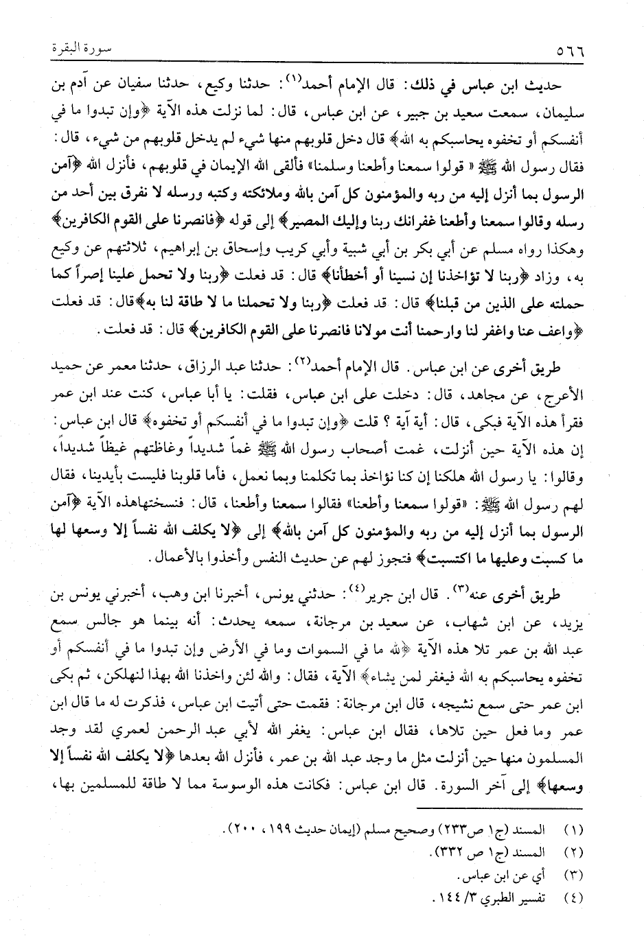 طَرِيقٌ أُخْرَى عَنْهُ «3» . قَالَ ابْنُ جَرِيرٍ «4» : حَدَّثَنِي يُونُسُ، أَخْبَرَنَا ابْنُ وَهْبٍ، أَخْبَرَنِي يُونُسُ بْنُ يَزِيدَ، عَنِ ابْنِ شِهَابٍ، عَنْ سَعِيدِ بْنِ مَرْجَانَةَ، سَمِعَهُ يُحَدِّثُ: أَنَّهُ بَيْنَمَا هو جالس سمع عَبْدِ اللَّهِ بْنِ عُمَرَ تَلَا هَذِهِ الْآيَةَ لِلَّهِ مَا فِي السَّماواتِ وَما فِي الْأَرْضِ وَإِنْ تُبْدُوا مَا فِي أَنْفُسِكُمْ أَوْ تُخْفُوهُ يُحاسِبْكُمْ بِهِ اللَّهُ فَيَغْفِرُ لِمَنْ يَشاءُ الْآيَةَ، فَقَالَ: وَاللَّهِ لَئِنْ وَاخَذَنَا اللَّهُ بِهَذَا لَنَهْلَكَنَّ، ثُمَّ بَكَى ابْنُ عُمَرَ حَتَّى سُمِعَ نَشِيجُهُ، قَالَ ابْنُ مَرْجَانَةَ: فَقُمْتُ حَتَّى أَتَيْتُ ابْنَ عَبَّاسٍ، فَذَكَرْتُ لَهُ مَا قَالَ ابْنُ عُمَرَ وما فعل حين تلاها، فقال ابن عَبَّاسٍ: يَغْفِرُ اللَّهُ لِأَبِي عَبْدِ الرَّحْمَنِ لَعَمْرِي لَقَدْ وَجَدَ الْمُسْلِمُونَ مِنْهَا حِينَ أُنْزِلَتْ مِثْلَ مَا وَجَدَ عَبْدُ اللَّهِ بْنُ عُمَرَ، فَأَنْزَلَ اللَّهُ بَعْدَهَا لَا يُكَلِّفُ اللَّهُ نَفْساً إِلَّا وُسْعَها إِلَى آخِرِ السُّورَةِ. قَالَ ابْنُ عَبَّاسٍ: فَكَانَتْ هَذِهِ الْوَسْوَسَةُ مِمَّا لَا طَاقَةَ لِلْمُسْلِمِينَ بها،