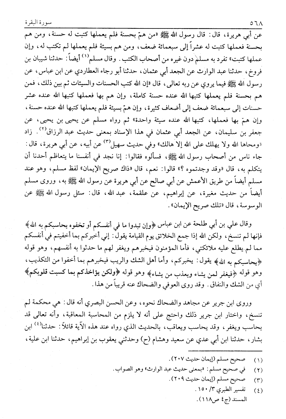عَنْ أَبِي هُرَيْرَةَ، قَالَ: قَالَ رَسُولُ اللَّهِ صَلَّى اللَّهُ عَلَيْهِ وَسَلَّمَ «مَنْ هَمَّ بِحَسَنَةٍ فَلَمْ يَعْمَلْهَا كُتِبَتْ لَهُ حَسَنَةً، وَمَنْ هَمَّ بِحَسَنَةٍ فَعَمِلَهَا كُتِبَتْ لَهُ عَشْرًا إِلَى سَبْعِمِائَةِ ضِعْفٍ، وَمَنْ هَمَّ بِسَيِّئَةٍ فَلَمْ يَعْمَلْهَا لَمْ تكتب له، وَإِنْ عَمِلَهَا كُتِبَتْ» تَفَرَّدَ بِهِ مُسْلِمٌ دُونَ غيره من أصحاب الكتب. وقال مسلم «1» أيضا: حَدَّثَنَا شَيْبَانُ بْنُ فَرُّوخٍ، حَدَّثَنَا عَبْدُ الْوَارِثِ عَنِ الْجَعْدِ أَبِي عُثْمَانَ، حَدَّثَنَا أَبُو رَجَاءٍ الْعُطَارِدِيُّ عَنِ ابْنِ عَبَّاسٍ، عَنْ رَسُولِ اللَّهِ صَلَّى اللَّهُ عَلَيْهِ وَسَلَّمَ فِيمَا يَرْوِي عَنْ رَبِّهِ تَعَالَى، قَالَ «إِنَّ اللَّهَ كَتَبَ الْحَسَنَاتِ وَالسَّيِّئَاتِ ثُمَّ بَيَّنَ ذَلِكَ، فَمَنْ هَمَّ بِحَسَنَةٍ فَلَمْ يَعْمَلْهَا كَتَبَهَا اللَّهُ عِنْدَهُ حَسَنَةً كَامِلَةً، وَإِنْ هَمَّ بِهَا فَعَمِلَهَا كَتَبَهَا اللَّهُ عِنْدَهُ عَشْرَ حَسَنَاتٍ إِلَى سَبْعِمِائَةِ ضِعْفٍ إِلَى أَضْعَافٍ كَثِيرَةٍ، وَإِنْ هَمَّ بِسَيِّئَةٍ فَلَمْ يَعْمَلْهَا كَتَبَهَا الله عنده حسنة، وَإِنْ هَمَّ بِهَا فَعَمِلَهَا، كَتَبَهَا اللَّهُ عِنْدَهُ سَيِّئَةً وَاحِدَةً» ثُمَّ رَوَاهُ مُسْلِمٌ عَنْ يَحْيَى بْنِ يَحْيَى، عَنْ جَعْفَرِ بْنِ سُلَيْمَانَ، عَنِ الْجَعْدِ أَبِي عُثْمَانَ فِي هَذَا الْإِسْنَادِ بِمَعْنَى حديث عبد الرزاق «2» . زاد «وَمَحَاهَا اللَّهُ وَلَا يَهْلَكُ عَلَى اللَّهِ إِلَّا هَالِكٌ» وَفِي حَدِيثِ سُهَيْلٍ «3» عَنْ أَبِيهِ، عَنْ أَبِي هُرَيْرَةَ، قَالَ: