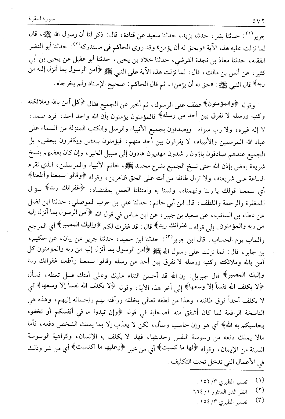 وَقَوْلُهُ وَالْمُؤْمِنُونَ عَطْفٌ عَلَى الرَّسُولُ، ثُمَّ أَخْبَرَ عَنِ الْجَمِيعِ فَقَالَ كُلٌّ آمَنَ بِاللَّهِ وَمَلائِكَتِهِ وَكُتُبِهِ وَرُسُلِهِ لَا نُفَرِّقُ بَيْنَ أَحَدٍ مِنْ رُسُلِهِ فَالْمُؤْمِنُونَ يُؤْمِنُونَ بِأَنَّ اللَّهَ وَاحِدٌ أَحَدٌ، فَرْدٌ صَمَدٌ، لَا إِلَهَ غَيْرُهُ، وَلَا رَبَّ سِوَاهُ. وَيُصَدِّقُونَ بِجَمِيعِ الْأَنْبِيَاءِ وَالرُّسُلِ وَالْكُتُبِ الْمُنَزَّلَةِ مِنَ السَّمَاءِ عَلَى عِبَادِ اللَّهِ الْمُرْسَلِينَ وَالْأَنْبِيَاءِ، لَا يُفَرِّقُونَ بَيْنَ أَحَدٍ مِنْهُمْ، فَيُؤْمِنُونَ بِبَعْضٍ وَيَكْفُرُونَ بِبَعْضٍ، بَلِ الْجَمِيعُ عِنْدَهُمْ صَادِقُونَ بارّون راشدون مهديون هادون إلى سبيل الْخَيْرِ، وَإِنْ كَانَ بَعْضُهُمْ يَنْسَخُ شَرِيعَةَ بَعْضٍ بِإِذْنِ اللَّهِ حَتَّى نُسِخَ الْجَمِيعُ بِشَرْعِ مُحَمَّدٍ صَلَّى اللَّهُ عَلَيْهِ وَسَلَّمَ، خَاتَمِ الْأَنْبِيَاءِ وَالْمُرْسَلِينَ، الَّذِي تَقُومُ السَّاعَةُ عَلَى شَرِيعَتِهِ، وَلَا تَزَالُ طَائِفَةٌ مِنْ أُمَّتِهِ عَلَى الْحَقِّ ظَاهِرِينَ، وَقَوْلُهُ وَقالُوا سَمِعْنا وَأَطَعْنا أَيْ سَمِعْنَا قَوْلَكَ يَا رَبَّنَا وَفَهِمْنَاهُ، وَقُمْنَا بِهِ وَامْتَثَلْنَا الْعَمَلَ بِمُقْتَضَاهُ، غُفْرانَكَ رَبَّنا سؤال للمغفرة وَالرَّحْمَةِ وَاللُّطْفِ، قَالَ ابْنُ أَبِي حَاتِمٍ: حَدَّثَنَا عَلِيُّ بْنُ حرب الموصلي، حدثنا ابن فضل عَنْ عَطَاءِ بْنِ السَّائِبِ، عَنْ سَعِيدِ بْنِ جُبَيْرٍ، عَنِ ابْنِ عَبَّاسٍ فِي قَوْلِ اللَّهِ آمَنَ الرَّسُولُ بِما أُنْزِلَ إِلَيْهِ مِنْ رَبِّهِ وَالْمُؤْمِنُونَ- إِلَى قَوْلِهِ- غُفْرانَكَ رَبَّنا قَالَ: قَدْ غفرت لكم وَإِلَيْكَ الْمَصِيرُ أي المرجع والمآب يوم الْحِسَابُ. قَالَ ابْنُ جَرِيرٍ «3» : حَدَّثَنَا ابْنُ حُمَيْدٍ، حَدَّثَنَا جرير عن بيان، عن حكيم، بن جَابِرٍ، قَالَ: لَمَّا نَزَلَتْ عَلَى رَسُولِ اللَّهِ صَلَّى اللَّهُ عَلَيْهِ وَسَلَّمَ آمَنَ الرَّسُولُ بِما أُنْزِلَ إِلَيْهِ مِنْ رَبِّهِ وَالْمُؤْمِنُونَ كُلٌّ آمَنَ بِاللَّهِ وَمَلائِكَتِهِ وَكُتُبِهِ وَرُسُلِهِ لَا نُفَرِّقُ بَيْنَ أَحَدٍ مِنْ رُسُلِهِ وَقالُوا سَمِعْنا وَأَطَعْنا غُفْرانَكَ رَبَّنا وَإِلَيْكَ الْمَصِيرُ