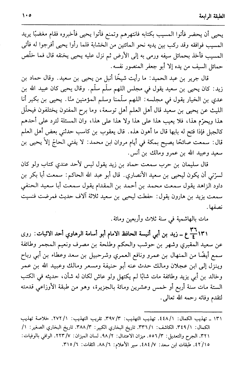 131- 36/ 4ع- زيد بن أبي أنيسة الحافظ الإمام أبو أسامة الرهاوي أحد الأثبات: روى عن سعيد المقبري وشهر بن حوشب والحكم وطلحة بن مصرف ونعيم المجمر وطائفة سمع أيضا من المنهال بن عمرو ونافع العمري وشرحبيل بن سعد وعطاء بن أبي رباح وينزل إلى ابن عجلان ومالك حدث عنه أبو حنيفة ومسعر ومالك وعبيد الله بن عمر وخالد بن أبي يزيد وطائفة مات شابا لم يكتهل ولو عاش لكان له شأن, حديثه في الكتب الستة مات سنة أربع أو خمس وعشرين ومائة بالجزيرة, وهو من طبقة الأوزاعي قدمته لتقدم وفاته رحمه الله تعالى.