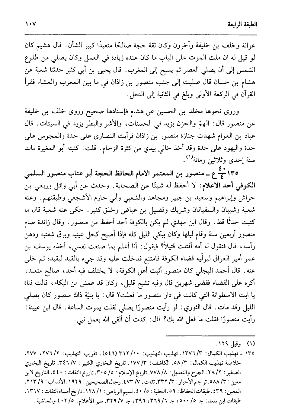 135- 40/ 4ع- منصور بن المعتمر الإمام الحافظ الحجة أبو عتاب منصور السلمي الكوفي أحد الأعلام: لا أحفظ له شيئا عن الصحابة. وحدث عن أبي وائل وربعي بن حراش وإبراهيم وسعيد بن جبير ومجاهد والشعبي وأبي حازم الأشجعي وطبقتهم وعن شعبة وشيبان والسفيانان وشريك وفضيل بن عياض وخلق كثير. حكى عنه شعبة قال: ما كتبت حديثا قط. وقال ابن مهدي لم يكن بالكوفة أحد أحفظ من منصور. وقال زائدة: صام منصور أربعين سنة وقام ليلها وكان يبكي الليل كله فإذا أصبح كحل عينيه وبرق شفتيه ودهن رأسه قال: فتقول له أمه: أقتلت قتيلا؟ فيقول: أنا أعلم بما صنعت نفسي, أخذه يوسف بن عمر أمير العراق ليوليه قضاء الكوفة فامتنع فدخلت عليه وقد جيء بالقيد ليقيده ثم خلى عنه، قال أحمد البجلي: كان منصور أثبت أهل الكوفة, لا يختلف فيه أحد صالح متعبد, أكره على القضاء فقضى شهرين، قال: وفيه تشيع قليل وكان قد عمش من البكاء قالت فتاة يا أبت الإسطوانة التي كانت في دار منصور ما فعلت قال: يا بنية ذاك منصور كان يصلي الليل وقد مات قال الثوري: لو رأيت منصورا يصلي لقلت يموت الساعة قال ابن عيينة: رأيت منصورا فقلت ما فعل الله بك قال كدت أن ألقى الله بعمل نبي.