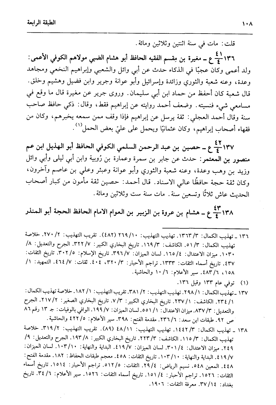 137- 42/ 4ع- حصين بن عبد الرحمن السلمي الحافظ أبو الهذيل بن عم منصور بن المعتمر: حدث عن جابر بن سمرة وعمارة بن رويبة وابن أبي ليلى وأبي وائل وزيد بن وهب وعدة, وعنه شعبة والثوري وأبو عوانة وعبثر وعلي بن عاصم وآخرون وكان ثقة حجة حافظا عالي الإسناد قال أحمد: حصين ثقة مأمون من كبار أصحاب الحديث، عاش ثلاثا وتسعين سنة؟ مات سنة ست وثلاثين ومائة.