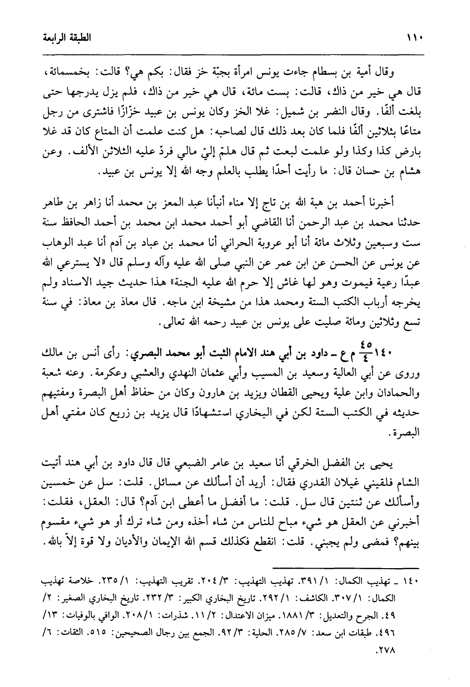 140- 45/ 4م ع- داود بن أبي هند الإمام الثبت أبو محمد البصري: رأى أنس بن مالك وروى عن أبي العالية وسعيد بن المسيب وأبي عثمان النهدي والشعبي وعكرمة. وعنه شعبة والحمادان وابن علية ويحيى القطان ويزيد بن هارون وكان من حفاظ أهل البصرة ومفتيهم حديثه في الكتب الستة لكن في البخاري استشهادًا قال يزيد بن زريع: كان مفتي أهل البصرة.