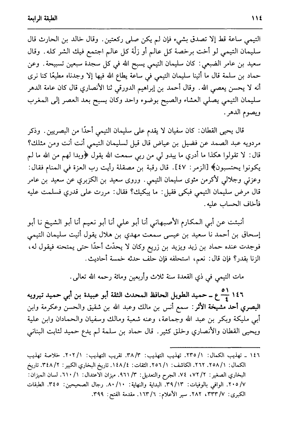 146- 51/ 4ع- حميد الطويل الحافظ المحدث الثقة أبو عبيدة بن أبي حميد تيرويه البصري أحد مشيخة الأثر: سمع أنس بن مالك وعبد الله بن شقيق والحسن وعكرمة وابن أبي مليكة وبكر بن عبد الله وجماعة وعنه شعبة ومالك وسفيان والحمادان وابن علية ويحيى القطان والأنصاري وخلق كثير. قال حماد بن سلمة: لم يدع حميد لثابت البناني