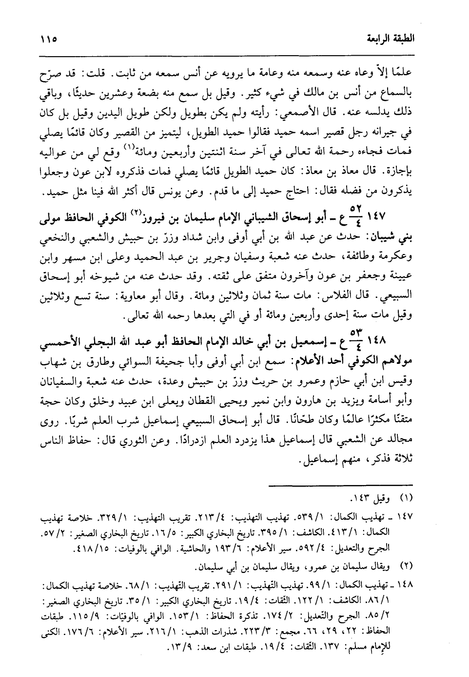 147- 52/ 4ع- أبو إسحاق الشيباني الإمام سليمان بن فيروز 2 الكوفي الحافظ مولى بني شيبان: حدث عن عبد الله بن أبي أوفى وابن شداد وزر بن حبيش والشعبي والنخعي وعكرمة وطائفة, حدث عنه شعبة وسفيان وجرير بن عبد الحميد وعلي بن مسهر وابن عيينة وجعفر بن عون وآخرون. متفق على ثقته. وقد حدث عنه من شيوخه أبو إسحاق السبيعي. قال الفلاس: مات سنة ثمان وثلاثين ومائة. وقال أبو معاوية: سنة تسع وثلاثين وقيل مات سنة إحدى وأربعين ومائة أو في التي بعدها رحمه الله تعالى.
