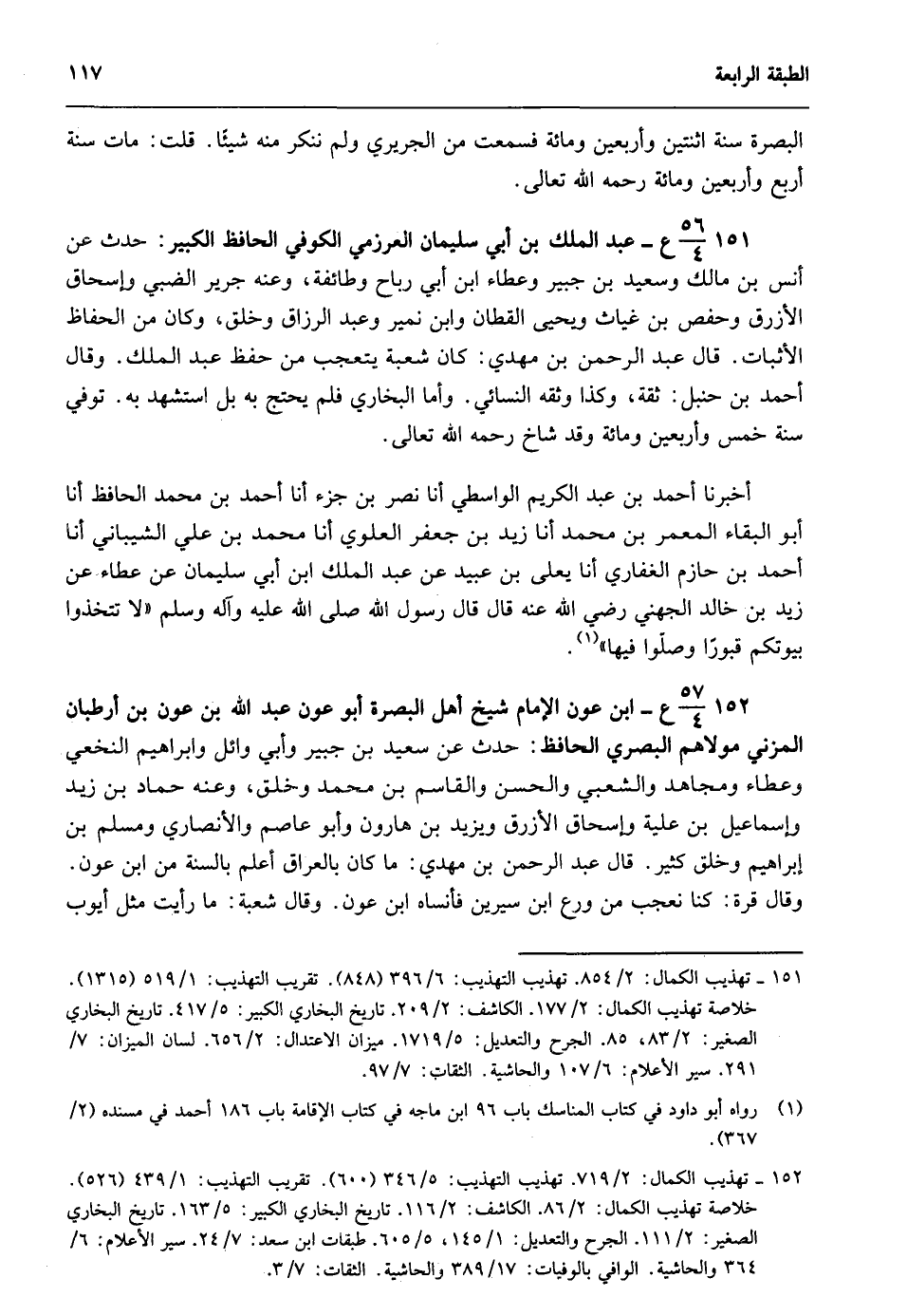 152- 57/ 4ع- ابن عون الإمام شيخ أهل البصرة أبو عون عبد الله بن عون بن أرطبان المزني مولاهم البصري الحافظ: حدث عن سعيد بن جبير وأبي وائل وإبراهيم النخعي وعطاء ومجاهد والشعبي والحسن والقاسم بن محمد وخلق, وعنه حماد بن زيد وإسماعيل بن علية وإسحاق الأزرق ويزيد بن هارون وأبو عاصم الأنصاري ومسلم بن إبراهيم وخلق كثير. قال عبد الرحمن بن مهدي: ما كان بالعراق أعلم بالسنة من بن عون. وقال قرة: كنا نعجب من ورع بن سيرين فأنساناه ابن عون. وقال شعبة: ما رأيت مثل أيوب