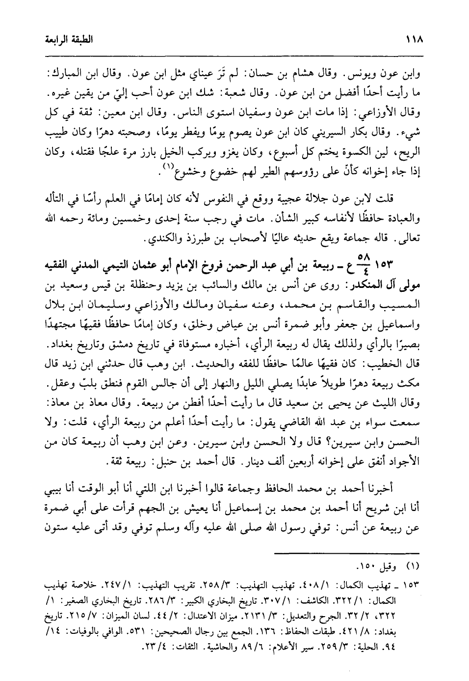 153- 58/ 4 ع- ربيعة بن أبي عبد الرحمن فروخ الإمام أبو عثمان التيمي المدني الفقيه مولى آل المنكدر: روى عن أنس بن مالك والسائب بن يزيد وحنظلة بن قيس وسعيد بن المسيب والقاسم بن محمد, وعنه سفيان ومالك والأوزاعي وسليمان بن بلال وإسماعيل بن جعفر وأبو ضمرة أنس بن عياض وخلق. وكان إماما حافظا فقيها مجتهدا بصيرا بالرأي ولذلك يقال له: ربيعة الراي. أخباره مستوفاة في تاريخ دمشق وتاريخ بغداد قال الخطيب: كان فقيها عالما حافظا للفقه والحديث. ابن وهب قال: حدثني بن زيد قال: مكث ربيعة دهرا طويلا عابدا يصلي الليل والنهار إلى أن جالس القوم فنطق بلب وعقل. وقال الليث: عن يحيى بن سعيد قال: ما رأيت أحدا أفطن من ربيعة. وقال معاذ بن معاذ: سمعت سواء بن عبد الله القاضي يقول: ما رأيت أحدا أعلم من ربيعة الرأي, قلت: ولا الحسن وابن سيرين؟ قال: ولا الحسن وابن سيرين. وعن ابن وهب أن ربيعة كان من الأجواد أنفق على إخوانه أربعين ألف دينار. قال أحمد بن حنبل: ربيعة ثقة.