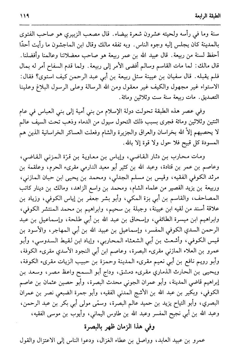 وفي عصر هذه الطبقة تحولت دولة الإسلام من بني أمية إلى بني العباس في عام اثنتين وثلاثين ومائة، فجرى بسبب ذلك التحول سيول من الدماء وذهب تحت السيف عالم لا يحصيهم إلا الله بخراسان والعراق والجزيرة والشام وفعلت العساكر الخراسانية الذين هم المسودة كل قبيح فلا حول ولا قوة إلا بالله.