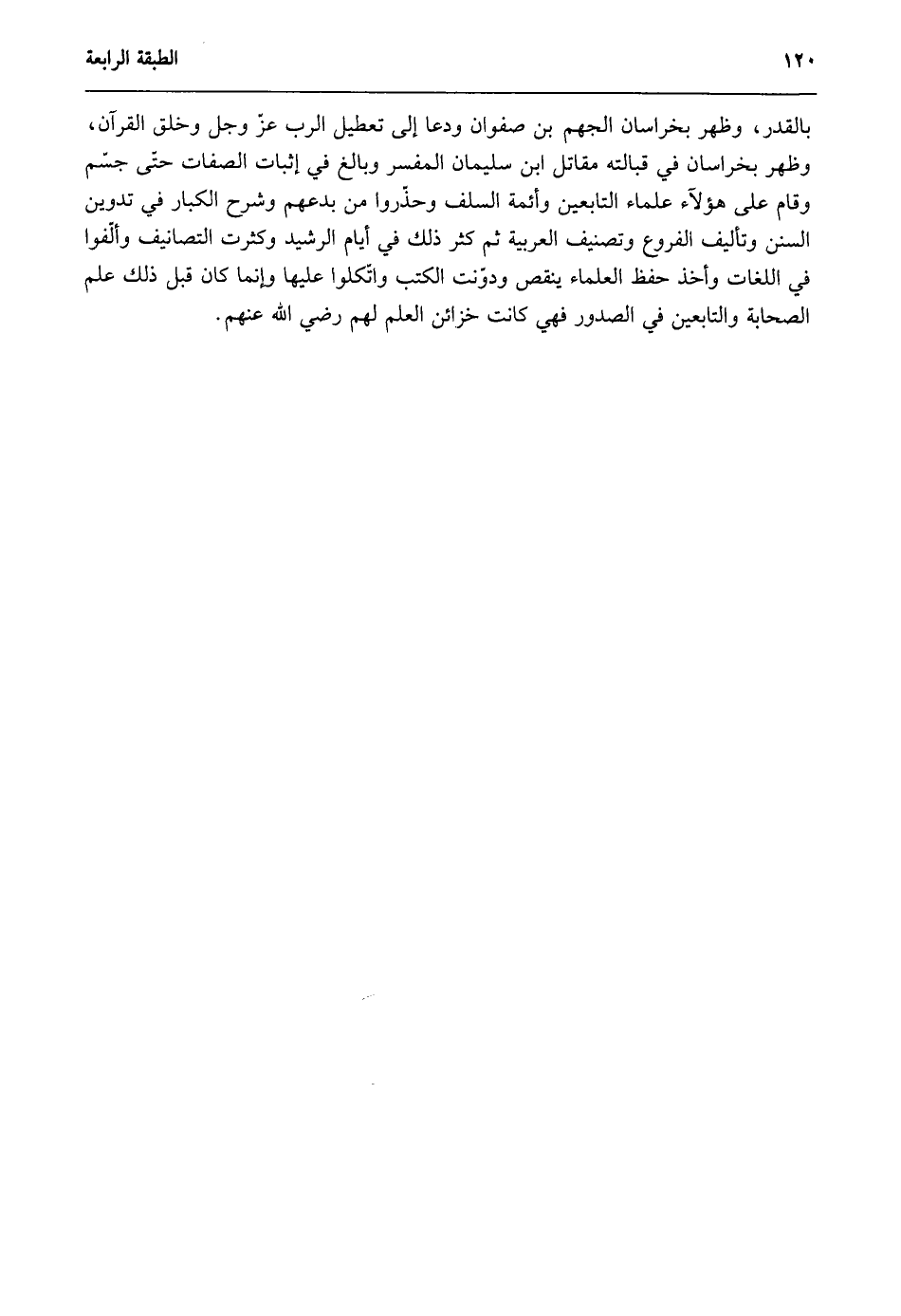 بالقدر, وظهر بخراسان الجهم بن صفوان ودعا إلى تعطيل الرب عز وجل وخلق القرآن, وظهر بخراسان في قبالته مقاتل بن سليمان المفسر وبالغ في إثبات الصفات حتى جسم، وقام على هؤلاء علماء التابعين وأئمة السلف وحذروا من بدعهم وشرع الكبار في تدوين السنن وتأليف الفروع وتصنيف العربية ثم كثر ذلك في أيام الرشيد وكثرت التصانيف وألفوا في اللغات وأخذ حفظ العلماء ينقص ودونت الكتب واتكلوا عليها وإنما كان قبل ذلك علم الصحابة والتابعين في الصدور؛ فهي كانت خزائن العلم لهم رضي الله عنهم.