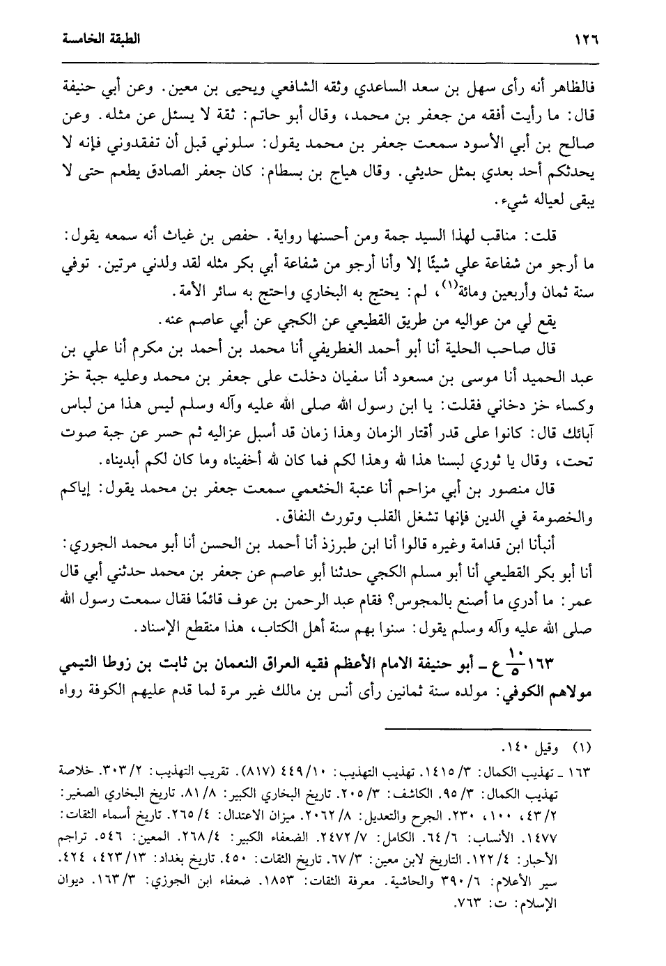 163- 10/ 5 ع- أبو حنيفة الإمام الأعظم فقيه العراق النعمان بن ثابت بن زوطا التيمي مولاهم الكوفي: مولده سنة ثمانين رأى أنس بن مالك غير مرة لما قدم عليهم الكوفة رواه