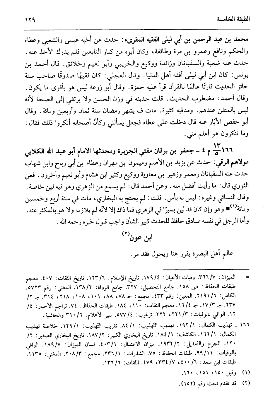 166- 13/ 5م 4- جعفر بن برقان مفتي الجزيرة ومحدثها الإمام أبو عبد الله الكلابي مولاهم الرقي: حدث عن يزيد بن الأصم وميمون بن مهران وعطاء بن أبي رباح وابن شهاب حدث عنه السفيانان ومعمر وزهير بن معاوية ووكيع وكثير بن هشام وأبو نعيم وآخرون، فعن الثوري قال: ما رأيت أفضل منه وعن أحمد قال: لم يسمع من الزهري وهو فيه لين خاصة وقال النسائي وغيره: ليس به بأس. قلت: لم يحتج به البخاري. مات في سنة أربع وخمسين ومائة1 وهو وإن كان قد لين يسيرا في الزهري فما ذاك إلا لأنه لم يلازمه ولا هو بالمكثر عنه, وأما الرجل في نفسه فصادق حافظ للحديث كبير الشأن واجب قبول خبره رحمه الله.