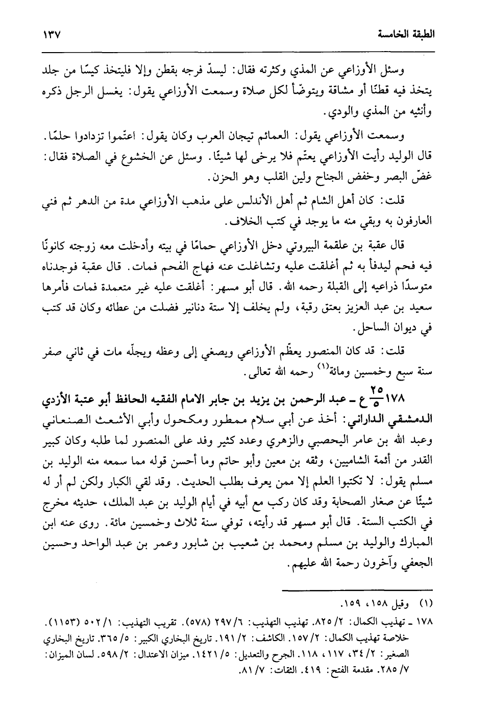 178- 25/ 5 ع- عبد الرحمن بن يزيد بن جابر الإمام الفقيه الحافظ أبو عتبة الأزدي الدمشقي الداراني: أخذ عن أبي سلام ممطور ومكحول وأبي الأشعث الصنعاني وعبد الله بن عامر اليحصبي والزهري وعدد كثير. وفد على المنصور لما طلبه وكان كبير القدر من أئمة الشاميين. وثقه ابن معين وأبو حاتم وما أحسن قوله مما سمعت منه الوليد بن مسلم يقول: لا تكتبوا العلم إلا ممن يعرف بطلب الحديث وقد لقي الكبار ولكن لم أر له شيئا عن صغار الصحابة وقد كان ركب مع أبيه في أيام الوليد بن عبد الملك. حديثه مخرج في الكتب الستة قال أبو مسهر: قد رأيته توفي سنة ثلاث وخمسين ومائة، روى عنه بن المبارك والوليد بن مسلم ومحمد بن شعيب بن شابور وعمر بن عبد الواحد وحسين الجعفي وآخرون رحمة الله عليهم.