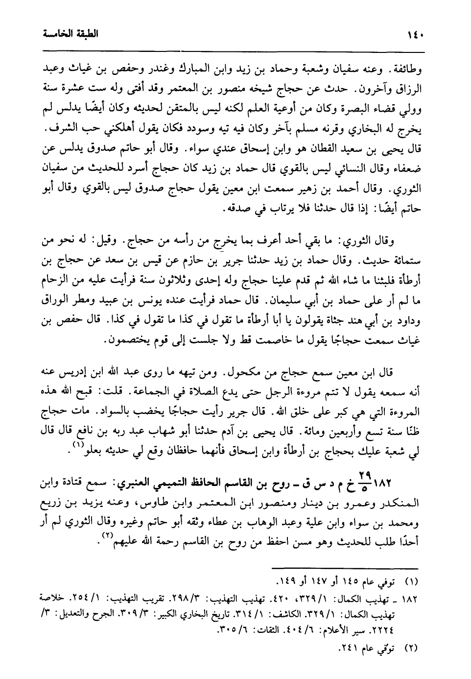 182- 29/ 5 - خ م د س ق- روح بن القاسم الحافظ التميمي العنبري: سمع قتادة وابن المنكدر وعمرو بن دينار ومنصور بن المعتمر وابن طاوس, وعنه يزيد بن زريع ومحمد بن سواء وابن علية وعبد الوهاب بن عطاء وثقه أبو حاتم وغيره وقال الثوري لم ار أحدا طلب الحديث وهو مسن احفظ من روح بن القاسم رحمة الله عليهم2.