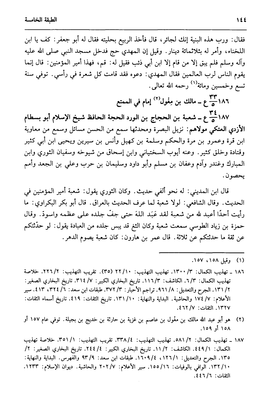 187- 34/ 5ع- شعبة بن الحجاج بن الورد الحجة الحافظ شيخ الإسلام أبو بسطام الأزدي العتكي مولاهم: نزيل البصرة ومحدثها سمع من الحسن مسائل وسمع من معاوية بن قرة وعمرو بن مرة والحكم وسلمة بن كهيل وأنس بن سيرين ويحيى بن أبي كثير وقتادة وخلق كثير. وعنه أيوب السختياني وابن إسحاق من شيوخه وسفيان الثوري وابن المبارك وغندر وآدم وعفان بن مسلم وأبو داود وسليمان بن حرب وعلي بن الجعد وأمم لا يحصون.