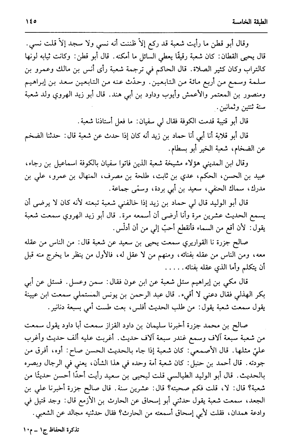 وقال أبو قطن ما رأيت شعبة قد ركع إلا ظننت أنه نسي ولا سجد إلا قلت نسي. قال يحيى القطان: كان شعبة رقيقًا يعطي السائل ما أمكنه. قال أبو قطن: وكانت ثيابه لونها كالتراب وكان كثير الصلاة. قال الحاكم في ترجمة شعبة رأى أنس بن مالك وعمرو بن سلمة وسمع من أربع مائة من التابعين. وحدث عنه من التابعين سعد بن إبراهيم ومنصور بن المعتمر والأعمش وأيوب وداود بن أبي هند. قال أبو زيد الهروي ولد شعبة سنة ثنتين وثمانين.