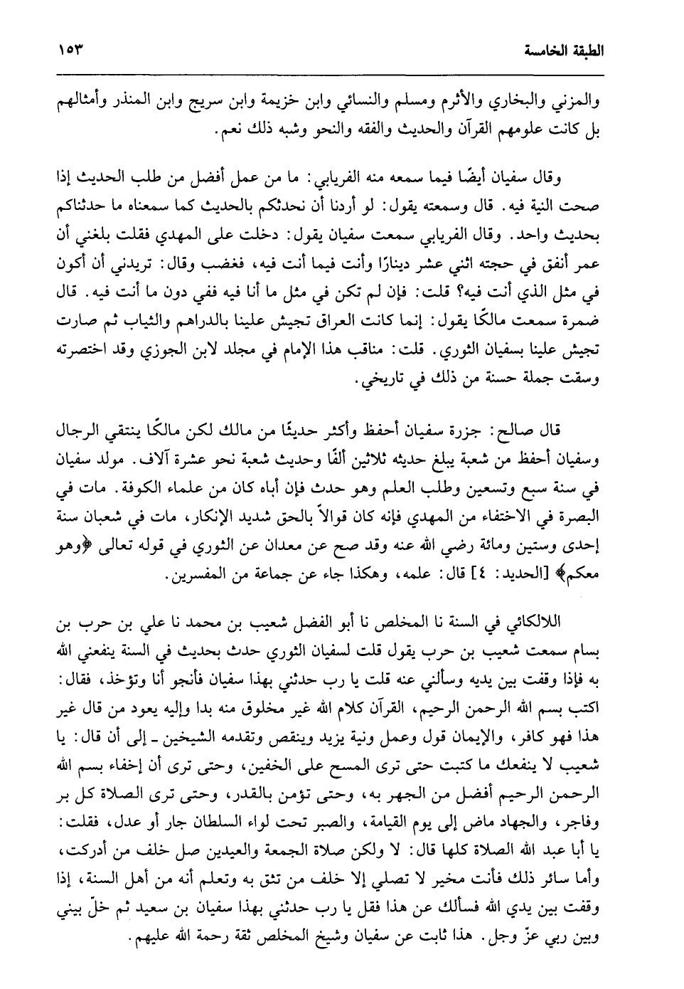 من الجهر به، وحتى تؤمن بالقدر، وحتى ترى الصلاة خلف كل بر وفاجر، والجهاد ماضِ إلى يوم القيامة، والصبر تحت لواء السلطان جار أو عدل، فقلت: يا أبا عبد الله الصلاة كلها قال: لا ولكن صلاة الجمعة والعيدين صل خلف من أدركت، وأما سائر ذلك فأنت مخير لا تصلي إلا خلف من تثق به وتعلم أنه من أهل السنة، إذا وقفت بين يدي الله فسألك عن هذا فقل يا رب حدثني بهذا سفيان بن سعيد ثم خلّ بيني وبين ربي عز وجل. هذا ثابت عن سفيان وشيخ المخلص ثقة رحمة الله عليهم.