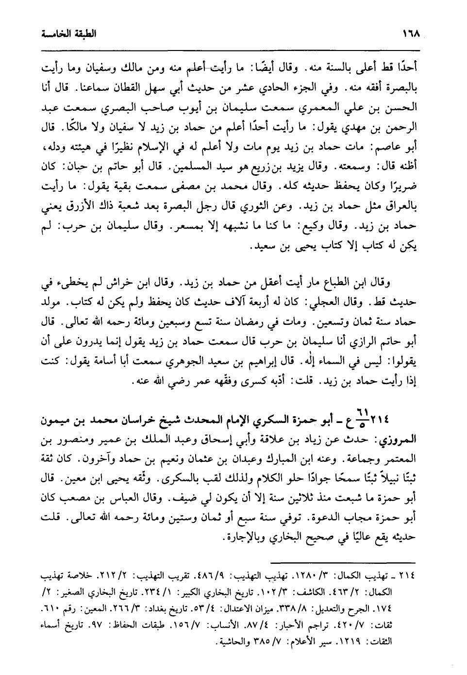 214- تهذيب الكمال: 3/ 1280. تهذيب التهذيب: 9/ 486. تقريب التهذيب: 2/ 212. خلاصة تهذيب الكمال: 2/ 463. الكاشف: 3/ 102. تاريخ البخاري الكبير: 1/ 234. تاريخ البخاري الصغير: 2/ 174. الجرح والتعديل: 8/ 338. ميزان الاعتدال: 4/ 53. تاريخ بغداد: 3/ 266. المعين: رقم 610. ثقات: 7/ 420. تراجم الأحبار: 4/ 87. الأنساب: 7/ 156. طبقات الحفاظ: 97. تاريخ أسماء الثقات: 1219. سير الأعلام: 7/ 385 والحاشية.