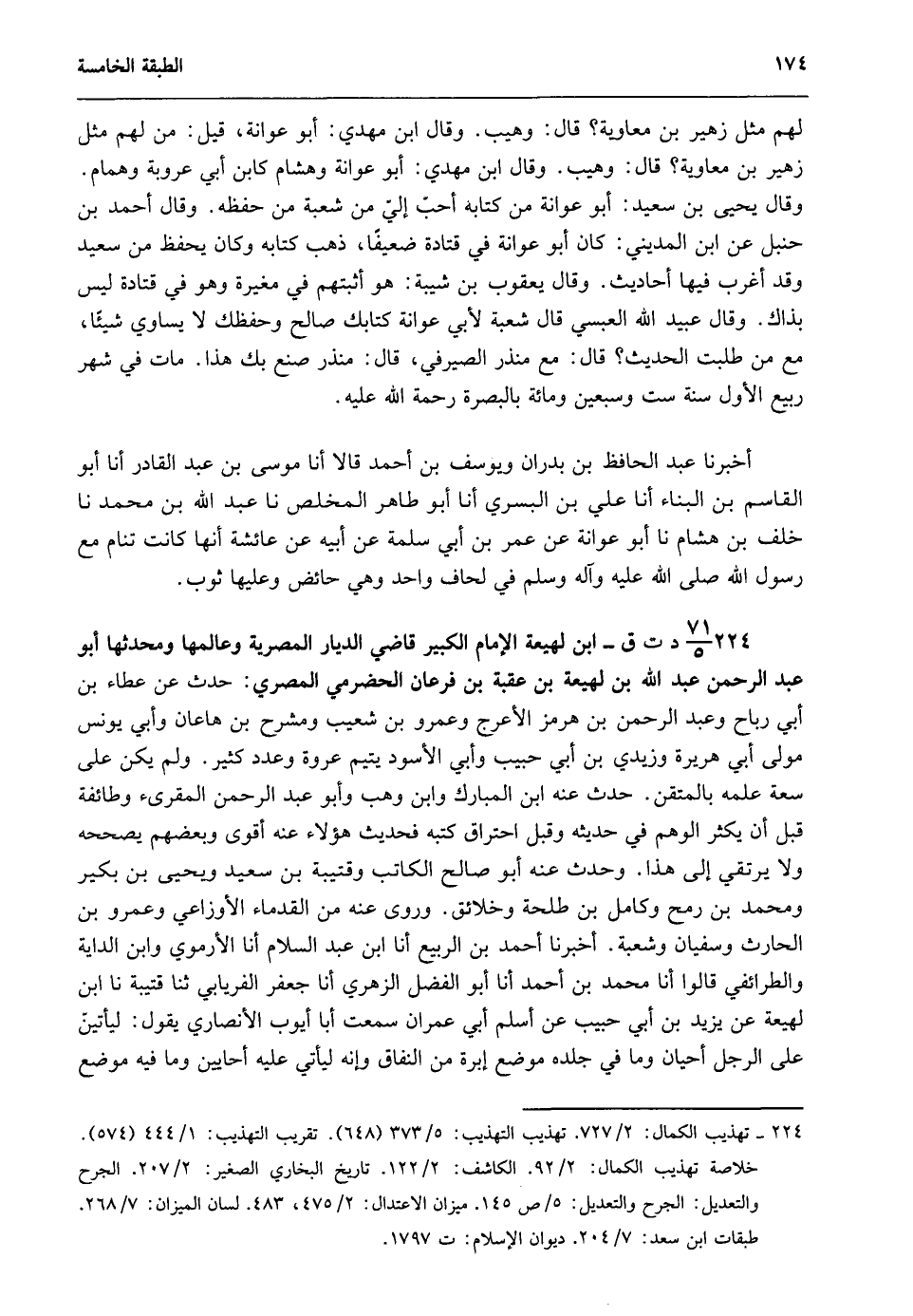 224- 71/ 5 د ت ق- ابن لهيعة الإمام الكبير قاضي الديار المصرية وعالمها ومحدثها أبو عبد الرحمن عبد الله بن لهيعة بن عقبة بن فرعان الحضرمي المصري: حدث عن عطاء بن أبي رباح وعبد الرحمن بن هرمز الأعرج وعمرو بن شعيب ومشرح بن هاعان وأبي يونس مولى أبي هريرة وزيدي بن أبي حبيب وأبي الأسود يتيم عروة وعدد كثير. ولم يكن على سعة علمه بالمتقن. حدث عنه ابن المبارك وابن وهب وأبو عبد الرحمن المقرئ وطائفة قبل أن يكثر الوهم في حديثه وقبل احتراق كتبه فحديث هؤلاء عنه أقوى وبعضهم يصححه ولا يرتقي إلى هذا. وحدث عنه أبو صالح الكاتب وقتيبة بن سعيد ويحيى بن بكير ومحمد بن رمح وكامل بن طلحة وخلائق. وروى عنه من القدماء الأوزاعي وعمرو بن الحارث وسفيان وشعبة. أخبرنا أحمد بن الربيع أنا ابن عبد السلام أنا الأرموي وابن الداية والطرائفي قالوا أنا محمد بن أحمد أنا أبو الفضل الزهري أنا جعفر الفريابي ثنا قتيبة نا ابن لهيعة عن يزيد بن أبي حبيب عن أسلم أبي عمران سمعت أبا أيوب الأنصاري يقول: ليأتين على الرجل أحيان وما في جلده موضع إبرة من النفاق وإنه ليأتي عليه أحايين وما فيه موضع