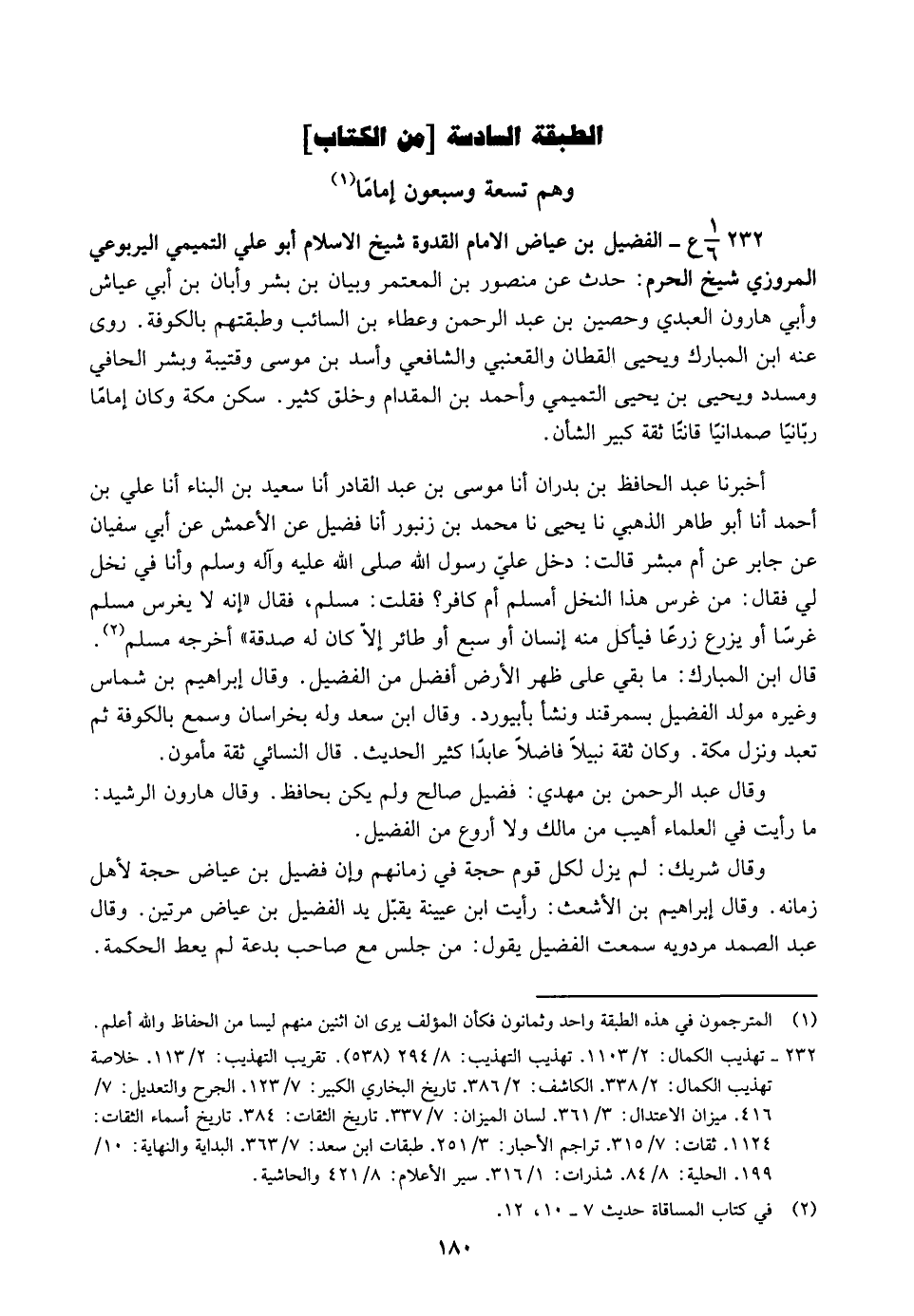 232- 1/ 6 ع- الفضيل بن عياض الإمام القدوة شيخ الإسلام أبو علي التميمي اليربوعي المروزي شيخ الحرم: حدث عن منصور بن المعتمر وبيان بن بشر وأبان بن أبي عياش وأبي هارون العبدي وحصين بن عبد الرحمن وعطاء بن السائب وطبقتهم بالكوفة. روى عنه ابن المبارك ويحيى القطان والقعنبي والشافعي وأسد بن موسى وقتيبة وبشر الحافي ومسدد ويحيى بن يحيى التميمي وأحمد بن المقدام وخلق كثير. سكن مكة وكان إماما ربانيا صمدانيا قانتا ثقة كبير الشأن.