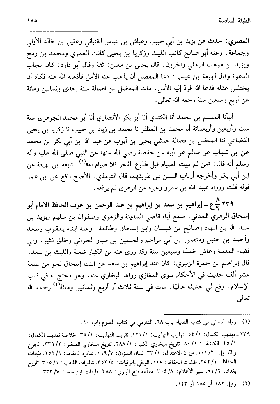 239- 8/ 6ع- إبراهيم بن سعد بن إبراهيم بن عبد الرحمن بن عوف الحافظ الإمام أبو إسحاق الزهري المدني: سمع أباه قاضى المدينة والزهري وصفوان بن سليم ويزيد بن عبد الله بن الهاد وصالح بن كيسان وابن إسحاق وطائفة. وعنه ابناه يعقوب وسعد وأحمد بن حنبل ومنصور بن أبي مزاحم والحسين بن سيار الحراني وخلق كثير. ولي قضاء المدينة وعاش خمسا وسبعين سنة وقد روى عنه من الكبار شعبة والليث بن سعد. قال إبراهيم بن حمزة الزبيري: كان عند إبراهيم بن سعد عن ابنت إسحاق نحو من سبعة عشر ألف حديث في الأحكام سوى المغازي رواها البخاري عنه، وهو محتج به في كتب الإسلام. وقع لي حديثه عاليا. مات في سنة ثلاث أو أربع وثمانين ومائة رحمه الله تعالى.
