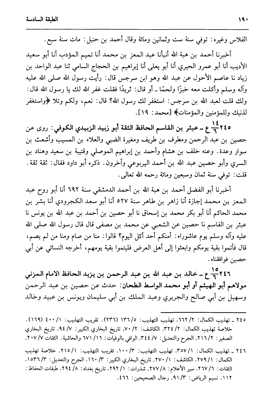 246- تهذيب الكمال: 1/ 357. تهذيب التهذيب: 3/ 100. تقريب التهذيب: 1/ 215. خلاصة تهذيب الكمال: 1/ 279. الكاشف: 1/ 270. تاريخ البخاري الكبير: 3/ 160. الجرح والتعديل: 3/ 1536. الثقات: 6/ 267. سير الأعلام: 8/ 277. شذرات: 1/ 292. تاريخ بغداد: 8/ 294. طبقات الحفاظ: 112. نسيم الرياض: 3/ 91. رجال الصحيحين: 466.