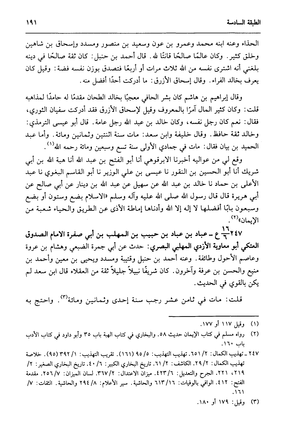 247- 16/ 6 ع- عباد بن عباد بن حبيب بن المهلب بن أبي صفرة الإمام الصدوق العتكي أبو معاوية الأزدي المهلبي البصري: حدث عن أبي جمرة الضبعي هشام بن عروة وعاصم الأحول وطائفة. وعنه أحمد بن حنبل وقتيبة ومسدد ويحيى بن معين وأحمد بن منيع والحسن بن عرفة وآخرون. كان شريفا نبيلا جليلا ثقة من العقلاء قال ابن سعد لم يكن بالقوي في الحديث.
