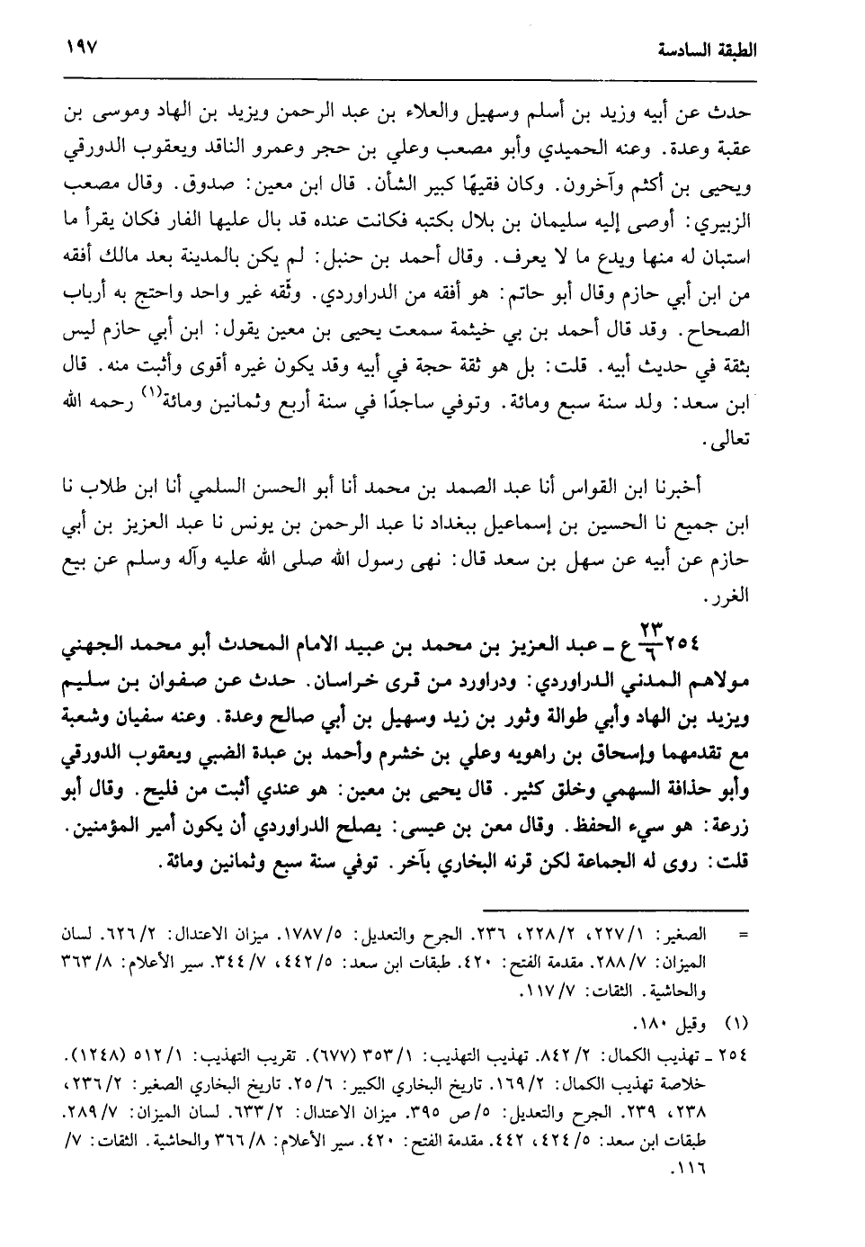 254- 23/ 6 ع- عبد العزيز بن محمد بن عبيد الإمام المحدث أبو محمد الجهني مولاهم المدني الدراودري: ودراورد من قرى خراسان. حدث عن صفوان بن سليم ويزيد بن الهاد وأبي طوالة وثور بن زيد وسهيل بن أبي صالح وعدة. وعنه سفيان وشعبة مع تقدمهما وإسحاق بن راهويه وعلي بن خشرم وأحمد بن عبدة الضبي ويعقوب الدورقي وأبو حذافة السهمي وخلق كثير. قال يحيى بن معين: هو عندي أثبت من فليح. وقال أبو زرعة: هو سيئ الحفظ. وقال معن بن عيسى: يصلح الدراوردي أن يكون أمير المؤمنين. قلت: روى له الجماعة لكن قرنه البخاري بآخر. توفي سنة سبع وثمانين ومائة.