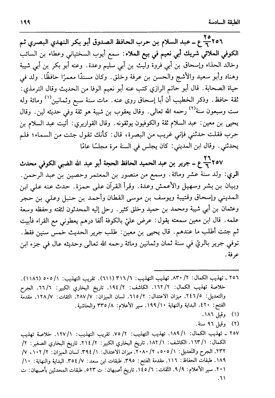 257- 26/ 6 ع- جرير بن عبد الحميد الحافظ الحجة أبو عبد الله الضبي الكوفي محدث الري: ولد سنة عشر ومائة. وسمع من منصور بن المعتمر وحصين بن عبد الرحمن. وبيان بن بشر وسهيل والأعمش وعدة. وقرأ القرآن على حمزة. حدث عنه علي ابن المديني وإسحاق وقتيبة ويوسف بن موسى القطان وأحمد بن حنبل وعلي بن حجر وعثمان بن أبي شيبة ومحمد بن حميد وخلق كثير. رحل إليه المحدثون لثقته وحفظه وسعة علمه. قال ابن معين سمعته يقول: عرض عليّ بالكوفة ألفا درهم يعطوني مع القراء فأبيت ثم جئت أطلب ما عندهم. قال يحيى ين معين: طلب جرير الحديث خمس سنين فقط. توفي جرير بالريّ في سنة ثمان وثمانين ومائة رحمه الله تعالى وحديثه عال في جزء ابن عرفة.