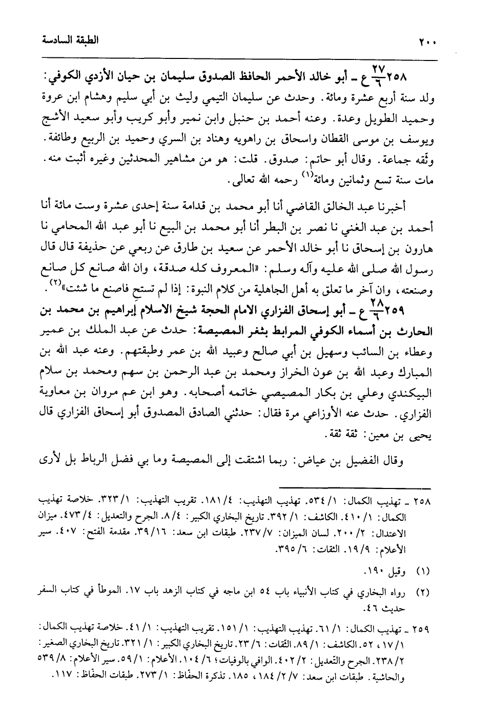 258- 27/ 6 ع- أبو خالد الأحمر الحافظ الصدوق سليمان بن حيان الأزدي الكوفي: ولد سنة أربع عشرة ومائة. وحدث عن سليمان التيمي وليث بن أبي سليم وهشام ابن عروة وحميد الطويل وعدة. وعنه أحمد بن حنبل وابن نمير وأبو كريب وأبو سعيد الأشج ويوسف بن موسى القطان وإسحاق بن راهويه وهناد بن السري وحميد بن الربيع وطائفة. وثقه جماعة. وقال أبو حاتم: صدوق. قلت: هو من مشاهير المحدثين وغيره أثبت منه. مات سنة تسع وثمانين ومائة1 رحمه الله تعالى.