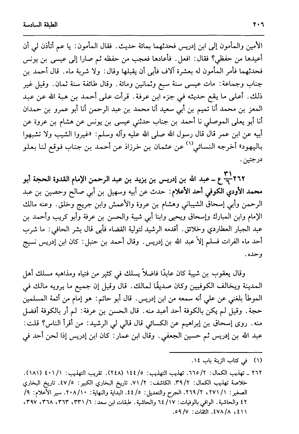 262- 31/ 6 ع- عبد الله بن إدريس بن يزيد بن عبد الرحمن الإمام القدوة الحجة أبو محمد الأودي الكوفي أحد الأعلام: حدث عن أبيه وسهيل بن أبي صالح وحصين بن عبد الرحمن وأبي إسحاق الشيباني وهشام بن عروة والأعمش وابن جريج وخلق. وعنه مالك الإمام وابن المبارك وإسحاق ويحيى وابنا أبي شيبة والحسن بن عرفة وأبو كريب وأحمد بن عبد الجبار العطاردي وخلائق. أقدمه الرشيد لتولية القضاء فأبى قال بشر الحافي: ما شرب أحد ماء الفرات فسلم إلا عبد الله بن إدريس. وقال أحمد بن حنبل: كان ابن إدريس نسيج وحده.